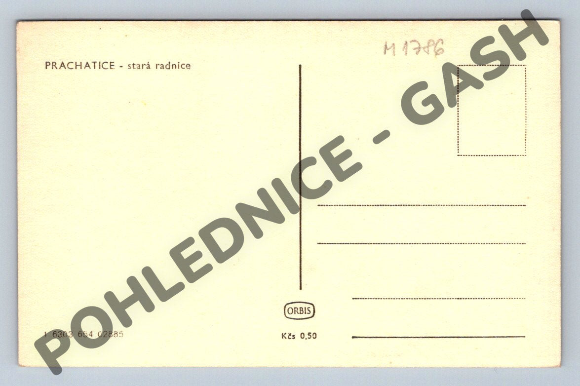 Originální černobílá pohlednice zobrazující starou radnici v Prachaticích. Historická budova na pohlednici má bohatě zdobené průčelí s renesančními sgrafity a zachycuje atmosféru města v minulosti. Na zadní straně pohlednice najdete předtištěný nápis PRACHATICE - stará radnice . Pohlednice není vyplněná ani odeslaná, vhodná pro sběratele i milovníky české historie a architektury. Vydavatel ORBIS, cena 0,50 Kčs. Velmi pěkný stav, minimální známky stáří.