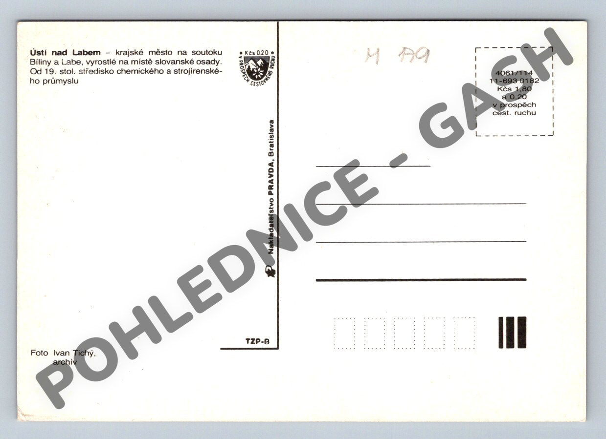 Originální pohlednice města Ústí nad Labem, významného krajského města na soutoku řek Bíliny a Labe. Pohlednice zachycuje několik dominantních míst a památek města, včetně městského centra, architektury a řeky Labe. Na zadní straně je krátký popis města: Ústí nad Labem – krajské město na soutoku Bíliny a Labe, vyrostlé na místě slovanské osady. Od 19. stol. středisko chemického a strojírenského průmyslu. Fotografie pořídil Ivan Tichý, vydavatelství Pravda, Bratislava. Pohlednice je neprošlá poštou, vhodná pro sběratele i milovníky regionální historie.