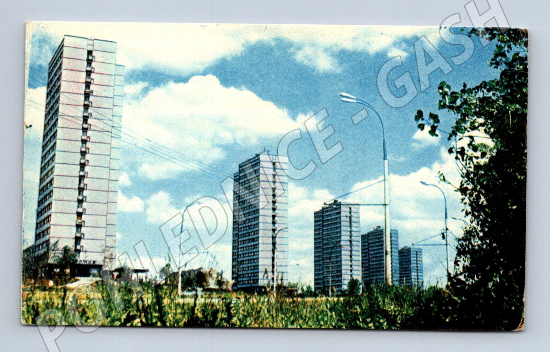 Originální pohlednice z roku 1969 zachycující obytné domy na Leninském prospektu v Moskvě. Fotografie V. Alyakina ukazuje typickou architekturu sovětské éry, charakteristickou pro rozsáhlé sídliště v hlavním městě bývalého Sovětského svazu. Na zadní straně pohlednice je popis v ruštině i angličtině. Vhodná sběratelská položka pro milovníky historie, architektury a ruské metropole. Stav viz foto, na zadní straně číslo tužkou.