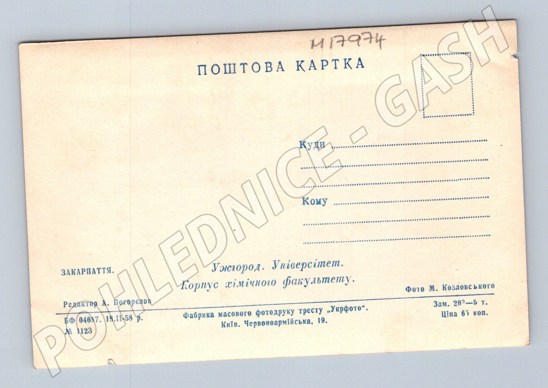 Originální černobílá pohlednice z období Sovětského svazu, vydaná v roce 1958. Pohlednice zachycuje hlavní budovu Univerzity v Užhorodu, konkrétně chemický fakultní blok. Na zadní straně je uvedeno vydavatelství Ukrofoto Kyjev a informace v ukrajinském jazyce. Rozměr klasický, pohlednice nebyla prošlá poštou, rohy jsou lehce otřepené (viz foto), jinak ve velmi dobrém stavu. Vhodná pro sběratele historických pohlednic či zájemce o regionální historii Zakarpatska a Ukrajiny.