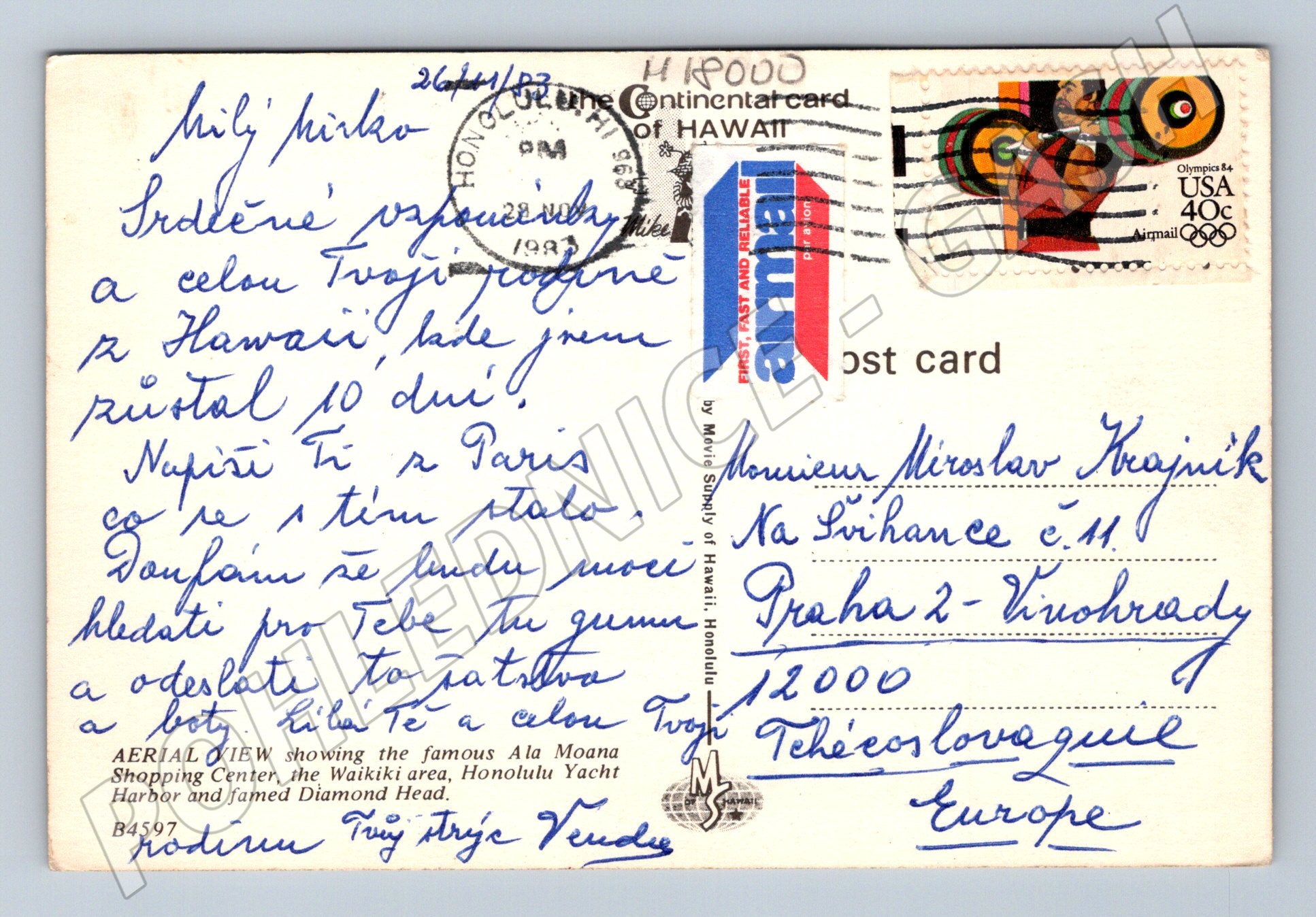 Originální pohlednice z Havaje, USA, zachycující letecký pohled na známou oblast Ala Moana Shopping Center a Waikiki v Honolulu. Na pohlednici je vidět panorama města, přístav Honolulu Yacht Harbor a ikonický tvar Diamond Head. Zadní strana je popsaná a opatřená americkým poštovním razítkem a známkou, datovaná rokem 1983. Ideální sběratelský kousek pro milovníky historických pohlednic, cestování či americké kultury. Výborný stav odpovídající stáří.