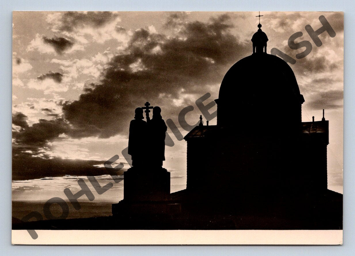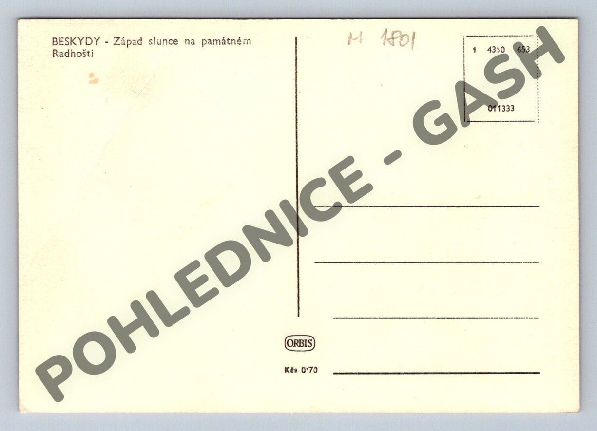 Pohlednice s motivem památníku na hoře Radhošť v Beskydech během západu slunce. Pohlednice zachycuje siluetu kaple sv. Cyrila a Metoděje a sousoší svatých, s dramatickou oblohou na pozadí. Na zadní straně je uveden nápis: BESKYDY – Západ slunce na památném Radhošti . Pohlednice je v černobílém provedení, ve velmi dobrém stavu, bez známek a zápisu. Jedná se o krásný sběratelský kousek s atmosférickou fotografií z významného místa Moravy. Vydavatel ORBIS, cca 1970.