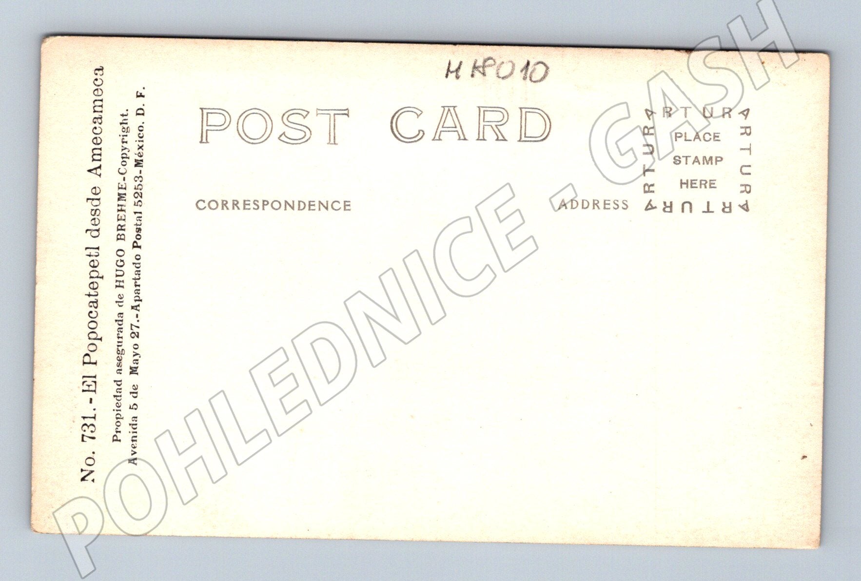 Originální stará pohlednice s názvem El Popocatépetl desde Amecameca , vydaná Hugo Brehme, Mexico. Na pohlednici je slavná mexická sopka Popocatépetl, jak je viděna z města Amecameca. Pohlednice je v černobílém provedení s uměleckým záběrem na vulkán v pozadí a s dramatickými siluetami stromů v popředí. Z druhé strany nechybí dobové označení pro adresu, známku a místo pro korespondenci. Neprošlá poštou, výborný sběratelský stav s mírnými známkami stáří a opotřebení na rozích. Ideální pro milovníky zahraničních, přírodních i uměleckých pohlednic ze začátku 20. století.