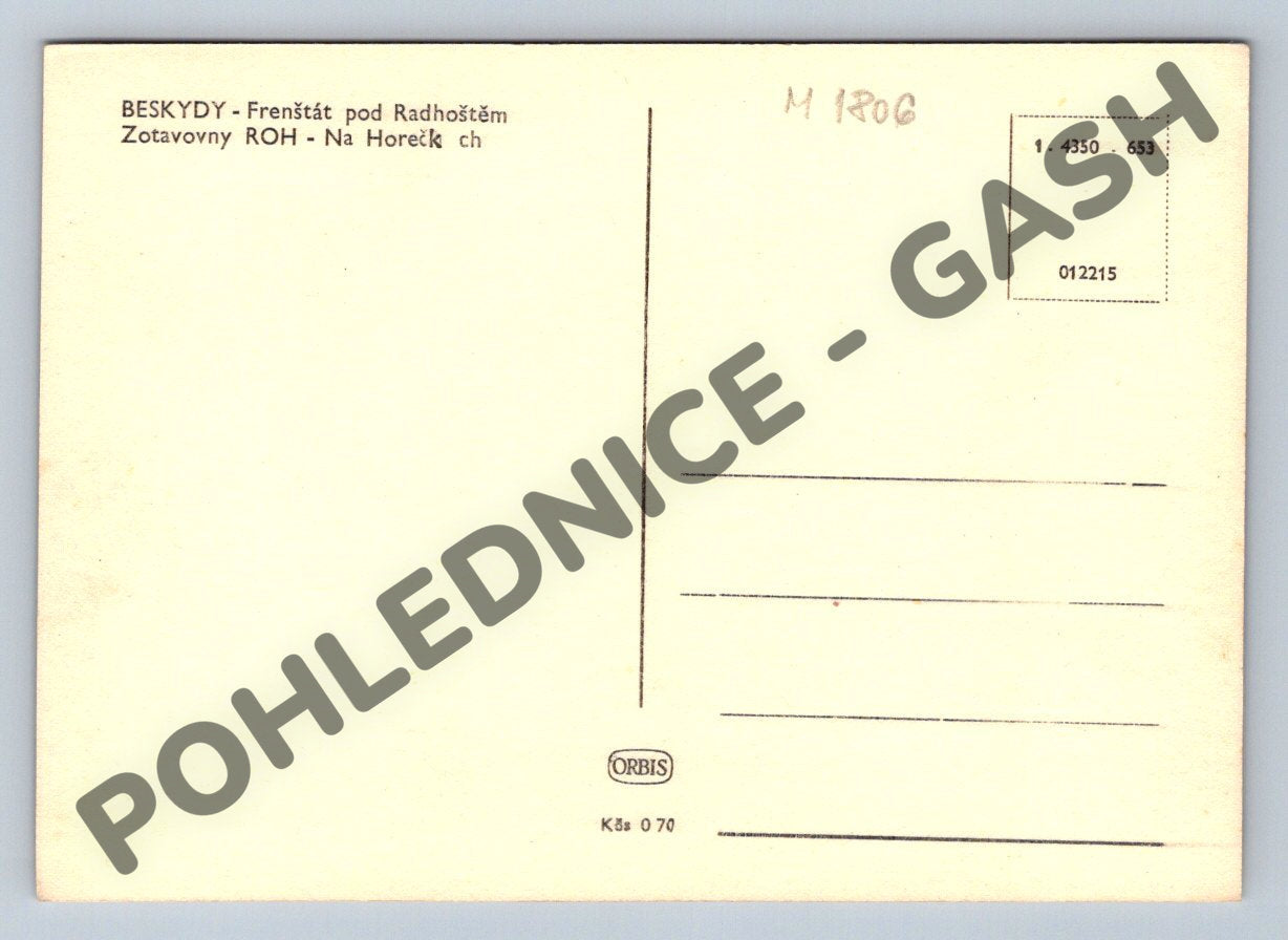 Starší černobílá pohlednice z oblasti Beskyd, konkrétně z Frenštátu pod Radhoštěm. Na fotografii je zachycena známá rekreační oblast Zotavovny ROH - Na Horečkách zasazená do krásné horské krajiny. Typický horský ráz s loukami, lesy a pozadím masivu Beskyd. Pohlednice je neprošlá poštou, má drobné známky stáří (na levém horním rohu mírně ohnutá). Na zadní straně vytištěn popis a logo vydavatele Orbis. Velmi pěkný sběratelský kousek dokumentující rekreační architekturu druhé poloviny 20. století v Československu.