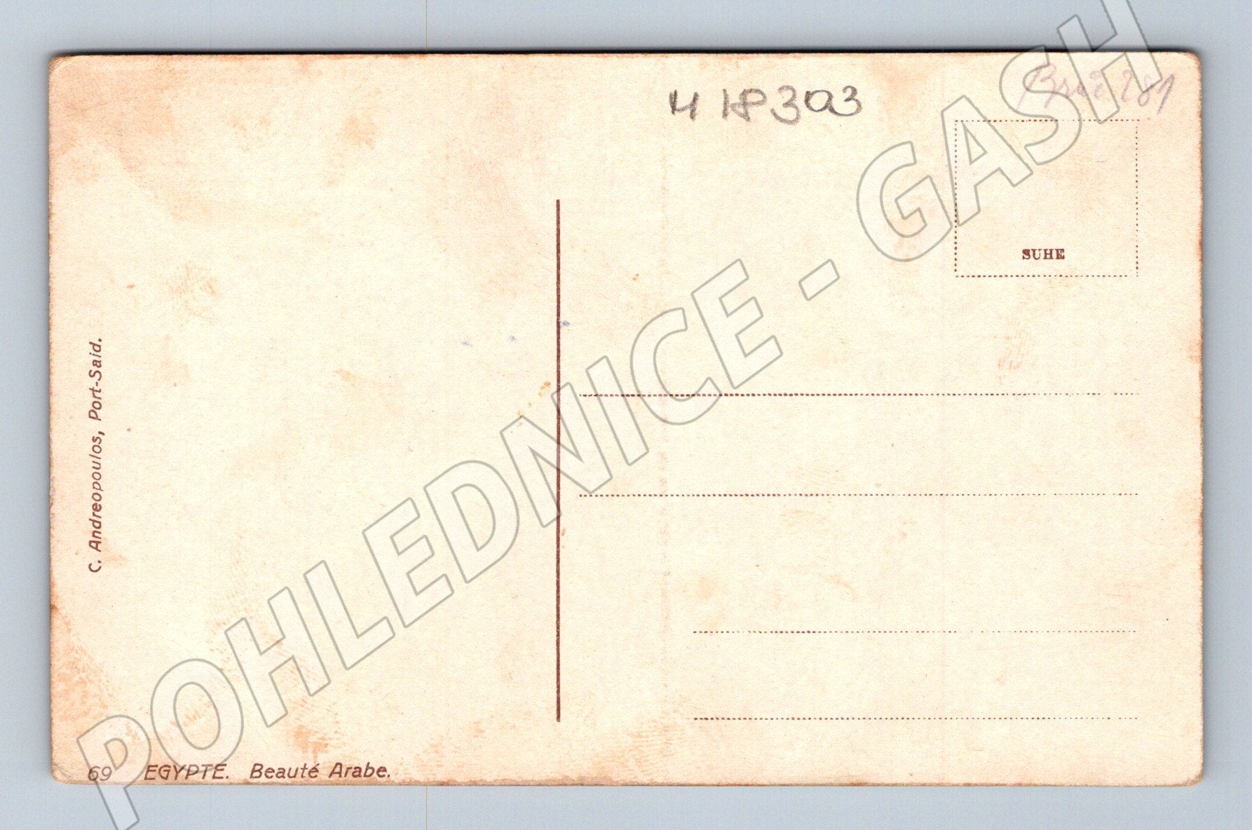 Originální kolorovaná pohlednice s názvem Egypt - Arabian Beauty z období počátku 20. století. Pohlednice zachycuje portrét mladé ženy v tradičním arabském oděvu s šátkem a šperky. Na zadní straně je uvedeno vydavatelství C. Andreopoulos, Port-Said, a označení E.GYPTE. Beauté Arabe , což potvrzuje původ pohlednice v Egyptě. Pohlednice je neprošlá poštou. Vhodné pro sběratele pohlednic s etnografickou a africkou tematikou.