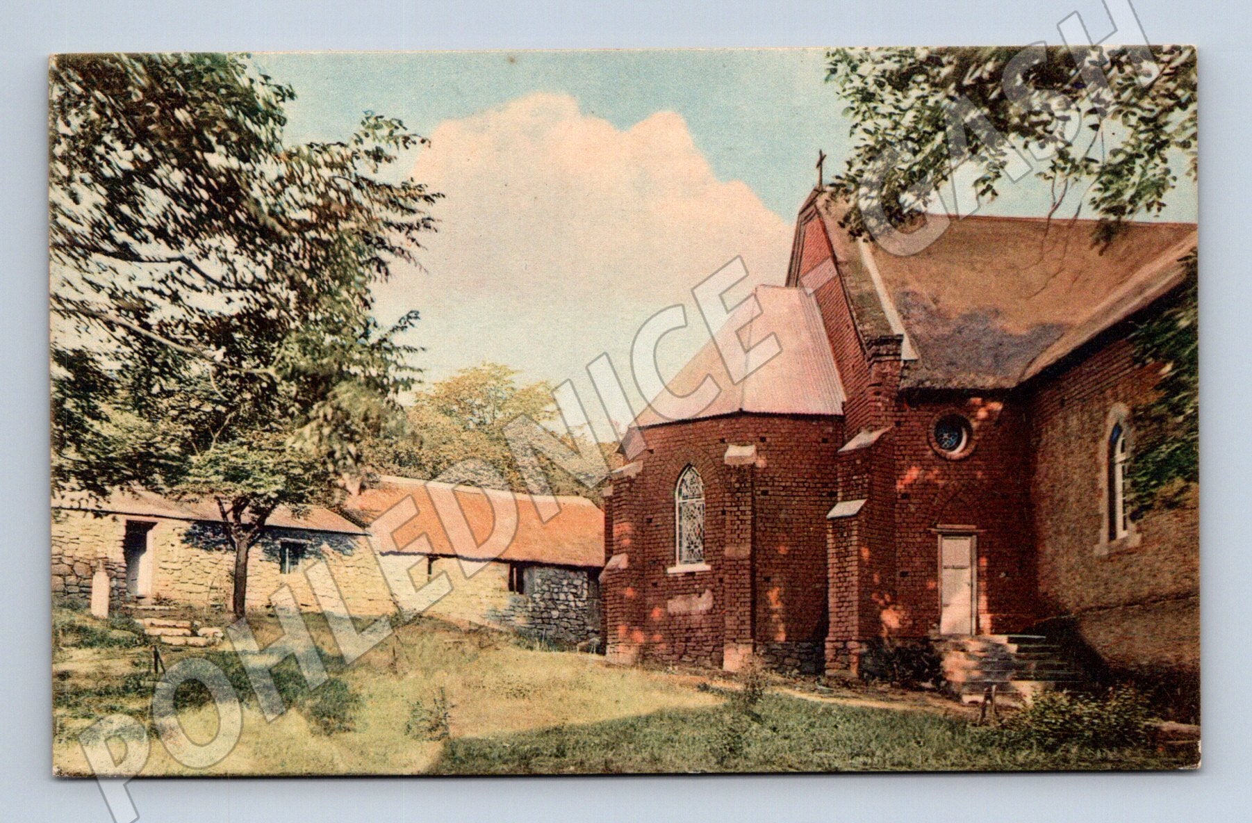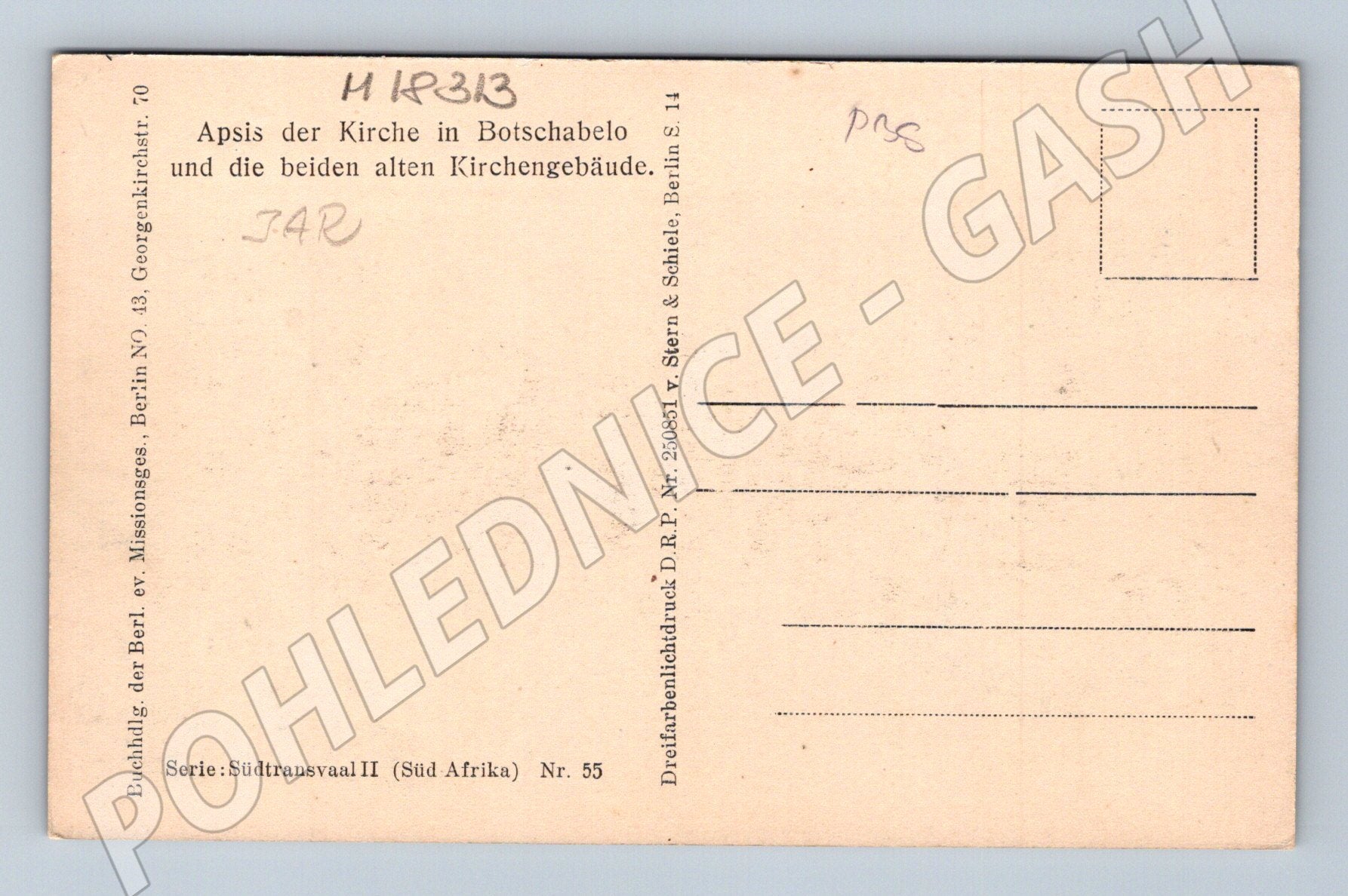 Originální barevná pohlednice ze série Südtransvaal II (Jižní Afrika), číslo 55. Na pohlednici je vyobrazena apsida kostela v Botschabelo spolu se dvěma starými kostelními budovami. Pohlednice je zachovalá, s nepopsanou zadní stranou, určena ke sběratelským účelům. Vydavatel: Verlag der Berl. ev. Missionsges. Berlin, Georgenkirchstr. 70. Text v němčině. Vhodné pro sběratele tematických pohlednic z Afriky, s motivem architektury a církevních staveb.