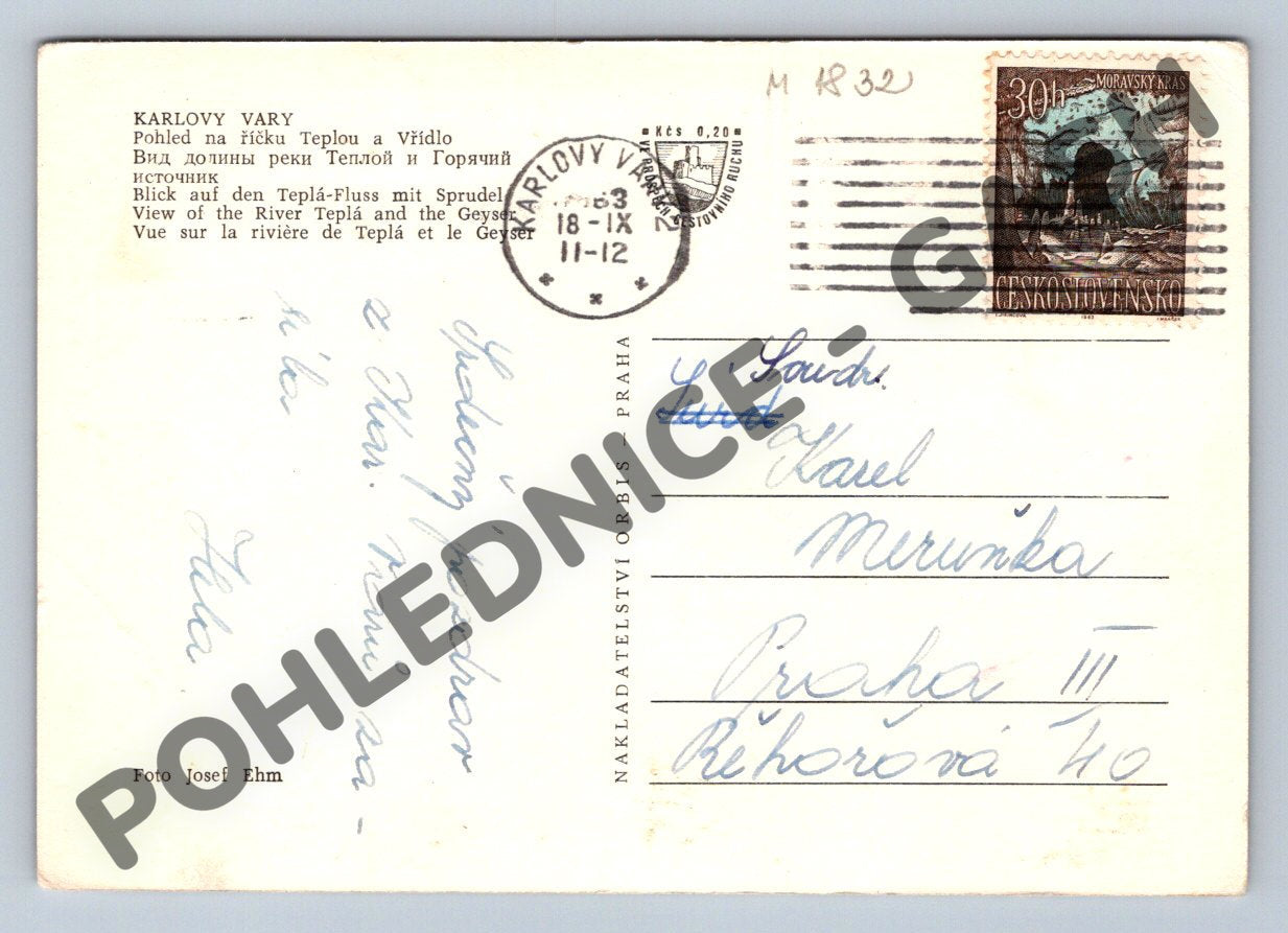 Originální pohlednice z Karlových Varů, zobrazující pohled na říčku Teplou, městskou kolonádu a v pozadí kostel sv. Máří Magdalény. Jedná se o klasickou černobílou pohlednici menšího formátu, jejímž autorem je známý fotograf Josef Ehm. Na zadní straně je pohlednice vyplněná, včetně poštovního razítka z Karlových Varů a tehdejší poštovní známky. Texty na zadní straně jsou v několika jazycích (čeština, ruština, němčina, angličtina, francouzština). Skvělý sběratelský kousek a dekorativní předmět zachycující atmosféru Karlových Varů v minulém století.