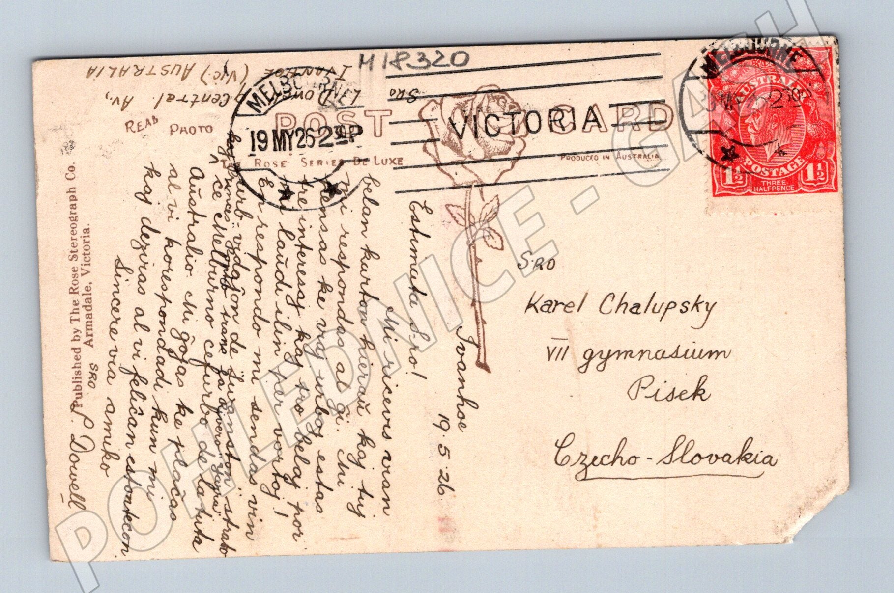 Originální černobílá pohlednice s motivem slavného Princes Bridge v Melbourne, stát Victoria, Austrálie. Pohlednice pochází z první poloviny 20. století a představuje krásu historické architektury města včetně okolní zahradní úpravy. Na zadní straně je ručně psaný text, adresa do Československa a australské poštovní razítko s tehdejší známkou 1½ pence. Pohlednice je zachovalá, s mírnými známkami stáří a opotřebením na rozích. Vhodné pro sběratele starých pohlednic, zájemce o Austrálii nebo tematiku měst a mostů.