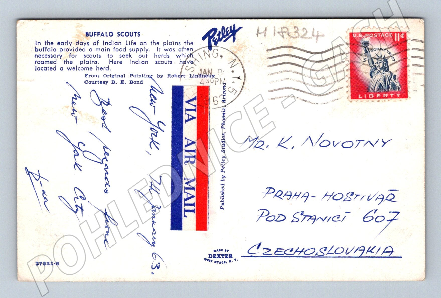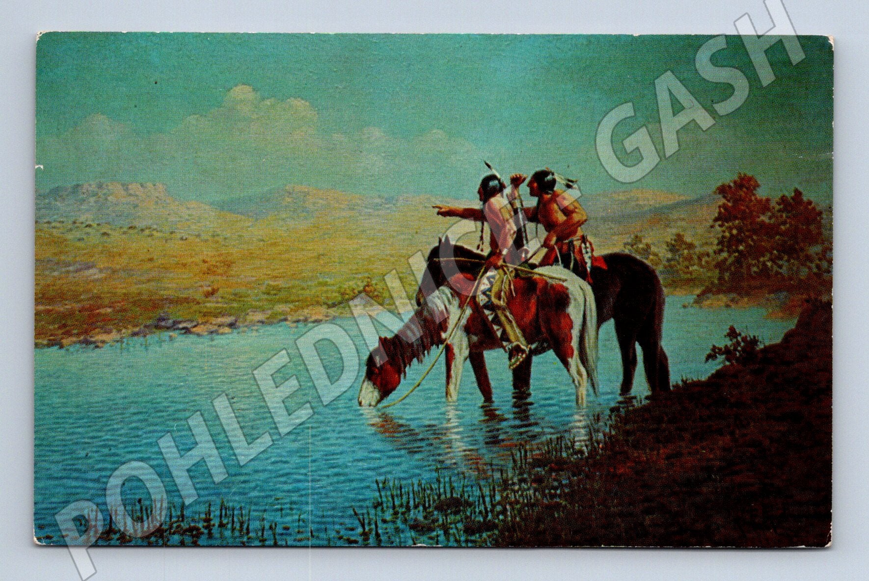 Originální stará pohlednice ze Severní Ameriky s motivem indiánských skautů na koních u řeky, podle díla Roberta Lindneuxe. Pohlednice byla odeslána leteckou poštou v roce 1963 z USA do Československa. Na zadní straně text v angličtině popisuje důležitost bizonů pro indiánský způsob života. Pohlednice je opatřena americkou známkou s motivem Sochy svobody a originálním rukopisným textem. Sbírkový stav – vhodné pro sběratele historických pohlednic i zájemce o americkou tematiku nebo etnografii. Rozměr klasický / standardní formát.