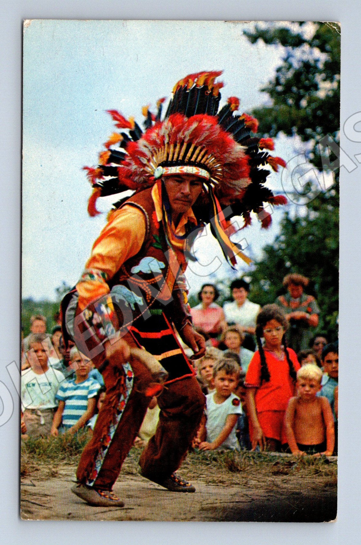Originální pohlednice ze Spojených států amerických, Long Island, zobrazující tradiční indiánský tanec kmene Shinnecock. Na fotografii je zachycený tanečník v pestrém kroji během Pow-Wow slavnosti, kterou sleduje dav diváků. Pohlednice je odeslaná z USA v roce 1961, s originální známkou a razítkem, včetně rukopisného textu a adresy dle dobových zvyklostí. Jedná se o zajímavý historický a etnografický dokument z oblasti Severní Ameriky. Vhodné pro sběratele pohlednic s motivy indiánů, americké historie či etnografie.