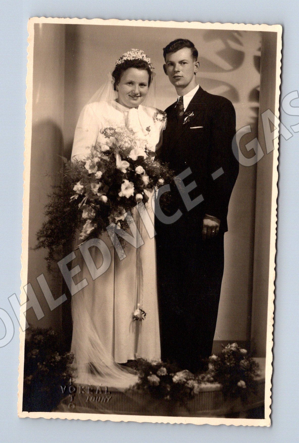 Originální černobílá svatební pohlednice z období první poloviny 20. století. Na pohlednici je zachycen svatební pár v tradičním slavnostním oblečení, nevěsta s velkou kyticí a závojem, ženich v tmavém obleku. Okraje pohlednice mají typické vlnkování, zadní strana je nepopsaná s místem pro známku a adresu. Stav pohlednice odpovídá stáří, dobře zachovaná, drobné známky manipulace. Skvělý sběratelský kousek pro milovníky historických fotografií. Vokřál Louny
