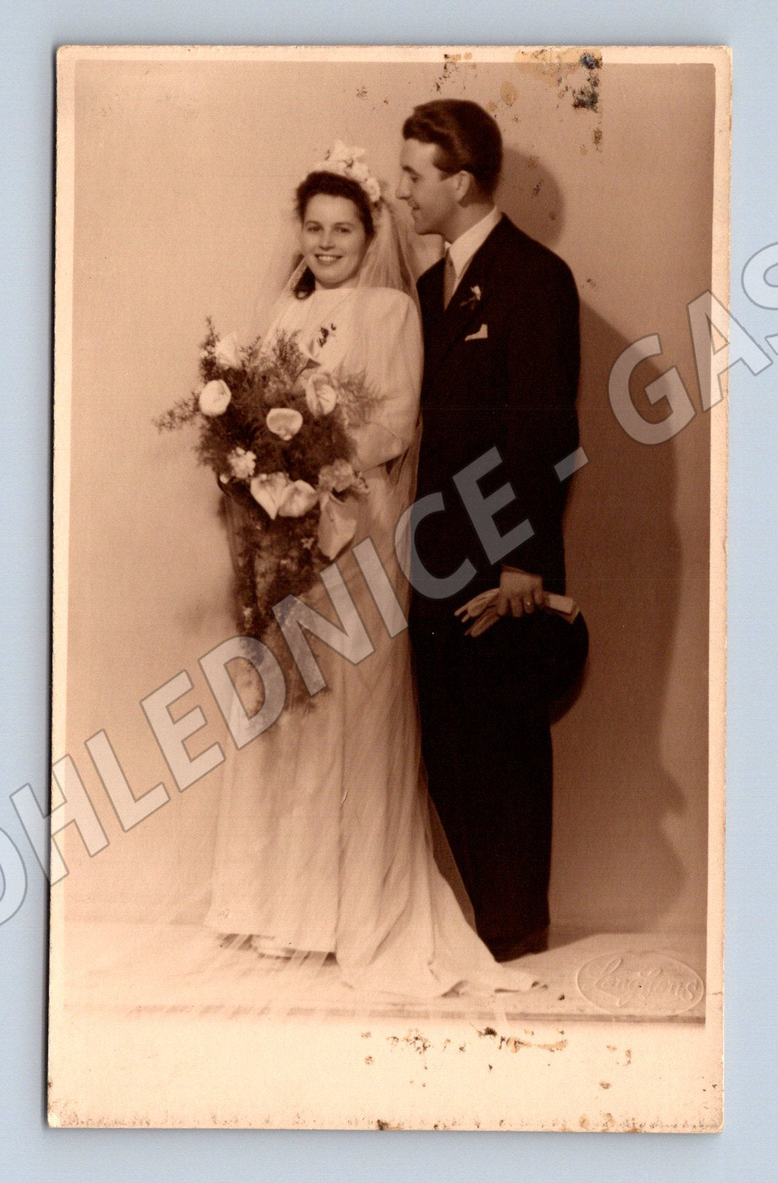 Nabízím originální starou svatební pohlednici s černobílou fotografií novomanželů. Pohlednice je ve formátu zhruba 9 x 14 cm, na přední straně se nachází snímek svatebního páru – ženicha v tmavém obleku a nevěsty ve svatebních šatech s kyticí. Fotografie je provedena v sepiovém tónu. Zadní strana je nepopsaná, pouze s několika známkami stáří (flíčky, lehké opotřebení na rozích). Jde o zajímavý dobový dokument, vhodný do sbírky pohlednic nebo jako dekorace do interiéru ve vintage stylu. Viz foto pro detailní stav předmětu.