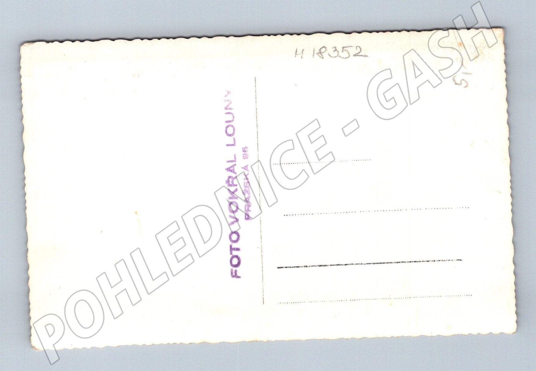 Originální černobílá ateliérová pohlednice ženy v elegantních šatech, pravděpodobně ze 40.–50. let 20. století. Fotografii pořídilo Foto Vokřál Louny (Pražská 85), což je uvedeno razítkem na zadní straně pohlednice. Pohlednice má klasický zoubkovaný okraj, zadní strana je nepopsaná, vhodná ke sběratelským účelům nebo jako originální dekorace. Celkově velmi dobrý stav, minimální známky stáří. Rozměr cca 14 x 9 cm.