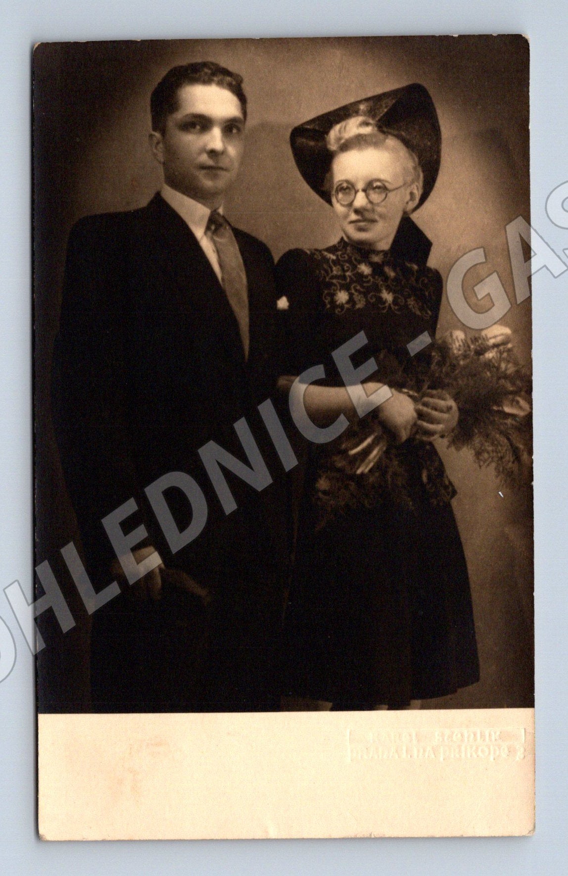 Starší černobílá pohlednice s etnografickým motivem. Na fotografii jsou zachyceni muž a žena v tradičních lidových krojích. Žena má brýle, čepcovou pokrývku hlavy a drží květiny. Typický portrét zřejmě ze střední Evropy, pravděpodobně období první poloviny 20. století. Rubová strana je čistá, bez textu, pouze s orientačními linkami pro adresu. Formát přibližně 14 x 9 cm, stav viz foto (zažloutnutí, stopy stáří, ošoupané rohy). Ideální pro sběratele pohlednic s etnografickou tématikou nebo zájemce o staré fotografie a lidové kroje.