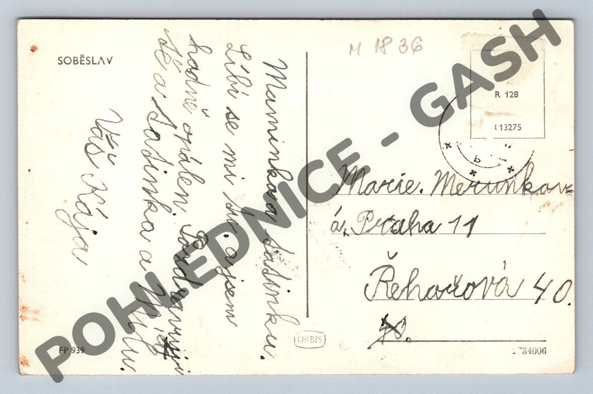 Originální černobílá pohlednice Soběslav znázorňující parkovou úpravu s fontánou a sochou, v pozadí budova z období první poloviny 20. století. Pohlednice je zaslaná, na zadní straně je ručně psaný vzkaz adresovaný do Prahy, jasně viditelné známky užívání a poštovní razítko. Pohlednice je v dobrém sběratelském stavu, bez většího poškození, drobné flíčky na zadní straně. Skvělý přírůstek do sbírky pohlednic z českých míst nebo pro milovníky historických pohlednic.