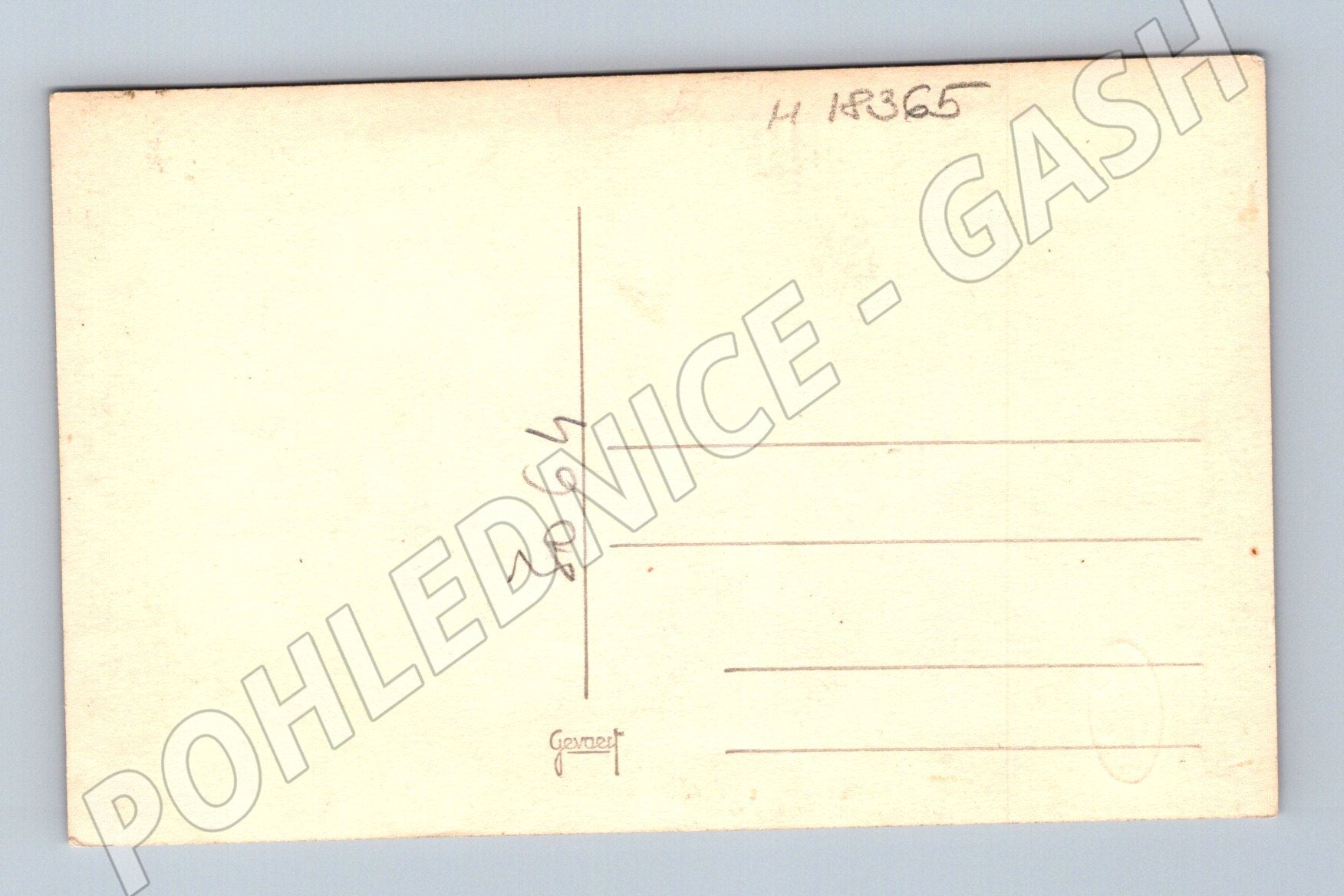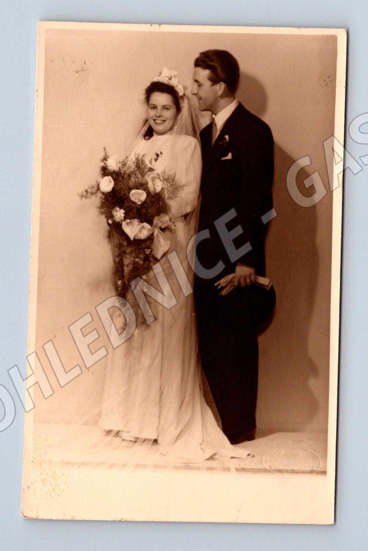 Starý svatební portrét na pohlednici, pravděpodobně z první poloviny 20. století. Pohlednice je ve velmi dobrém stavu s mírnými známkami stáří a opotřebení v rozích. Na přední straně je vyobrazen šťastný novomanželský pár s květinovou kyticí. Zadní strana pohlednice je čistá, bez textu i známky, s vyznačenými linkami pro adresu. U pohlednice je patrný klasický charakter malého formátu a stylové zpracování fotografie odpovídající době vzniku. Vhodné pro sběratele historických fotografií nebo milovníky retro svatební tematiky.