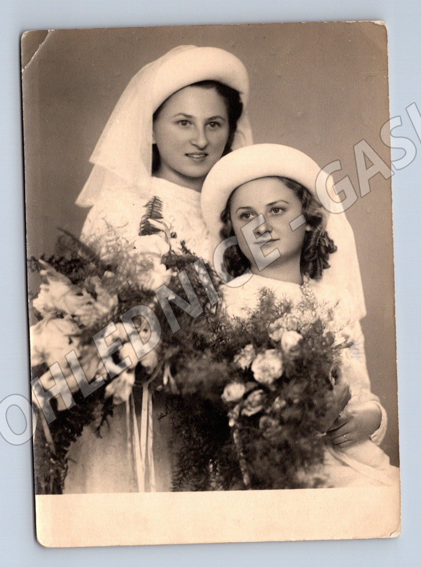 Stará pohlednice – dobový portrét dvou žen s kyticemi, Foto Sodomková Žatec