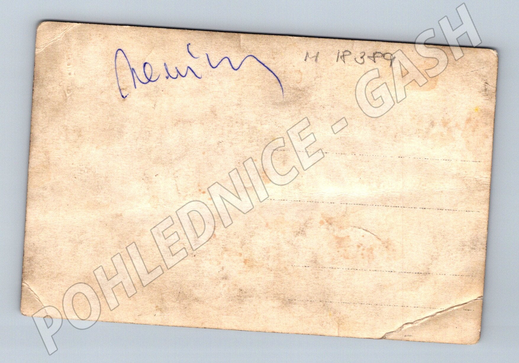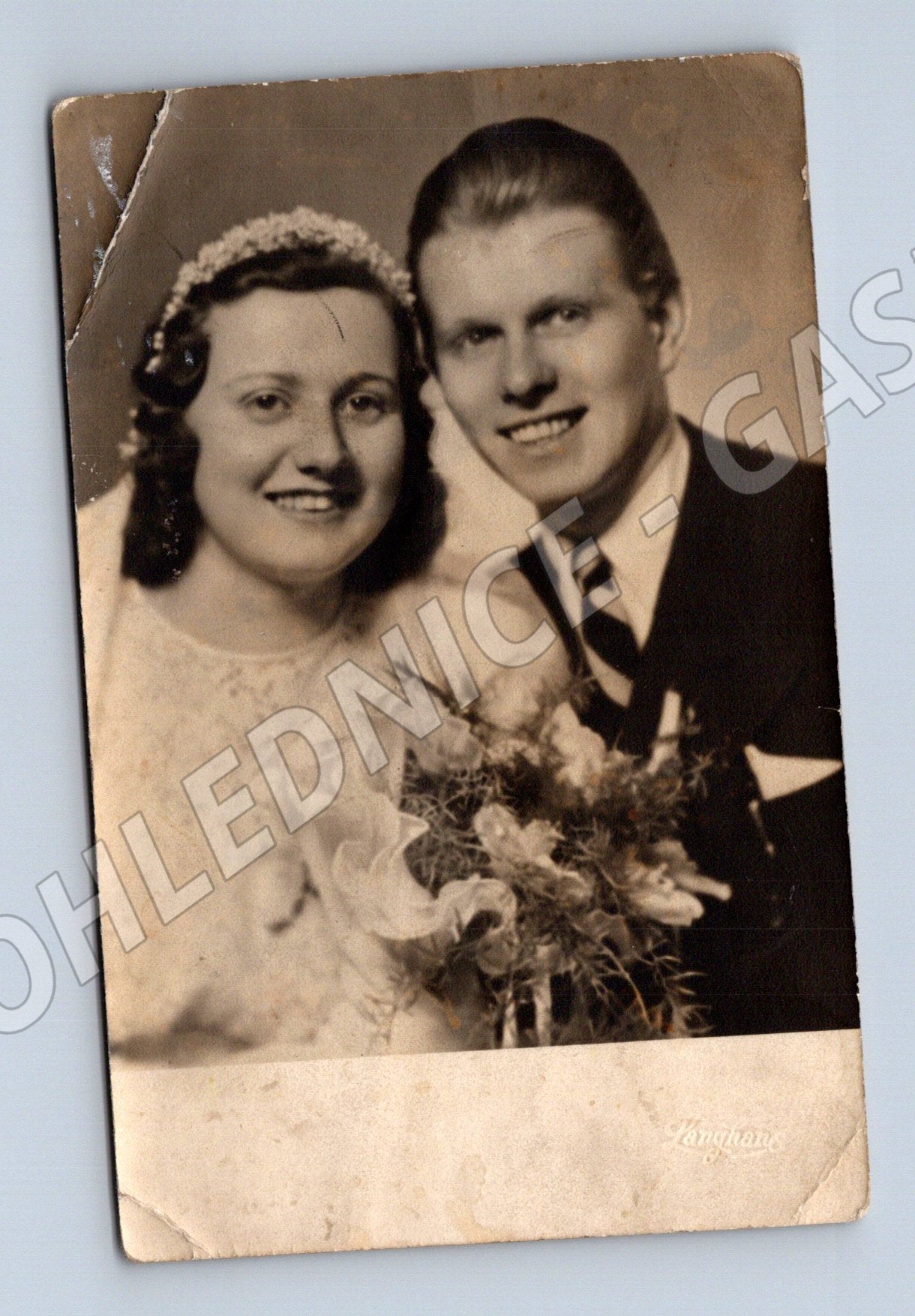 Originální stará svatební pohlednice s černobílou fotografií ženicha a nevěsty. Pohlednice je ve vintage stylu, pravděpodobně z první poloviny 20. století, což podporuje také ručně psaný vzkaz a datum na zadní straně (M 18 3 59). Pohlednice nese známky stáří, drobné ohyby v rozích a znečištění, přední strana s portrétem páru a květinou, zadní strana se vzdáleně čitelným zápisem. Vhodná do sbírky nebo jako dobová dekorace.