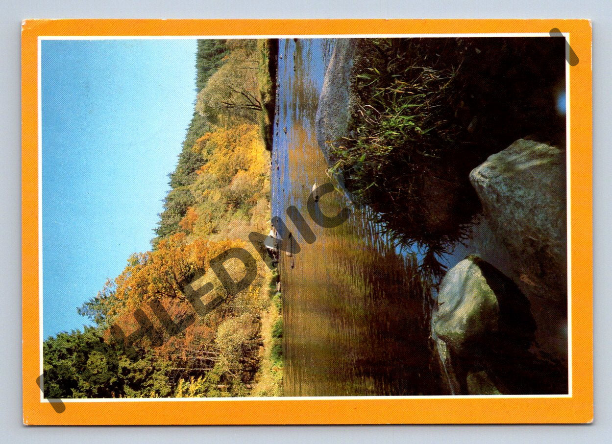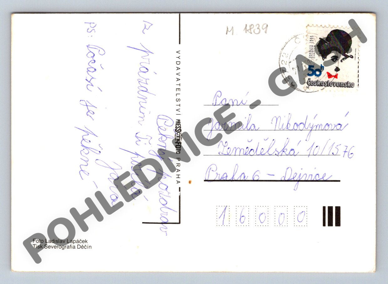 Originální barevná pohlednice s motivem české krajiny, fotografovaná Ladislavem Lapačkem a tištěná Severografií Děčín. Na přední straně je zobrazena řeka obklopená vzrostlými stromy v podzimních barvách, což vytváří velmi klidnou a příjemnou atmosféru. Zadní strana obsahuje ručně psaný vzkaz, poštovní známku s podobiznou a adresu příjemce z Prahy. Pohlednice je v dobrém sběratelském stavu, mírné opotřebení v rozích. Skvělý kousek do sbírky českých pohlednic z minulého století, vhodné pro milovníky přírody, historie i filokartisty.