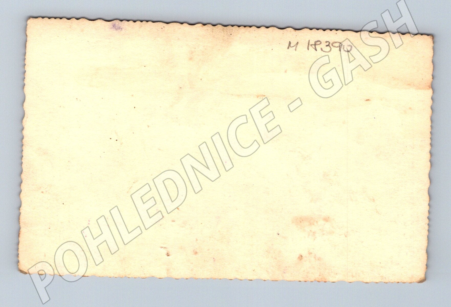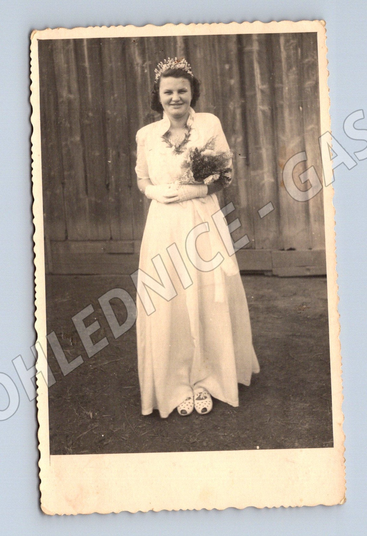 Originální černobílá pohlednice – portrét ženy ve slavnostních bílých šatech, pravděpodobně svatební nebo slavnostní moment. Dáma drží kytici, na hlavě má zdobnou čelenku s květinami a stojí před dřevěnou zdí. Typický zvlněný okraj pohlednice, známky stáří a patiny, zadní strana bez textu (čistá), pouze malý rukopisný nápis v rohu. Pohlednice je velmi dobře zachovaná, vhodná do sbírky historických portrétů či k dalšímu zpracování.