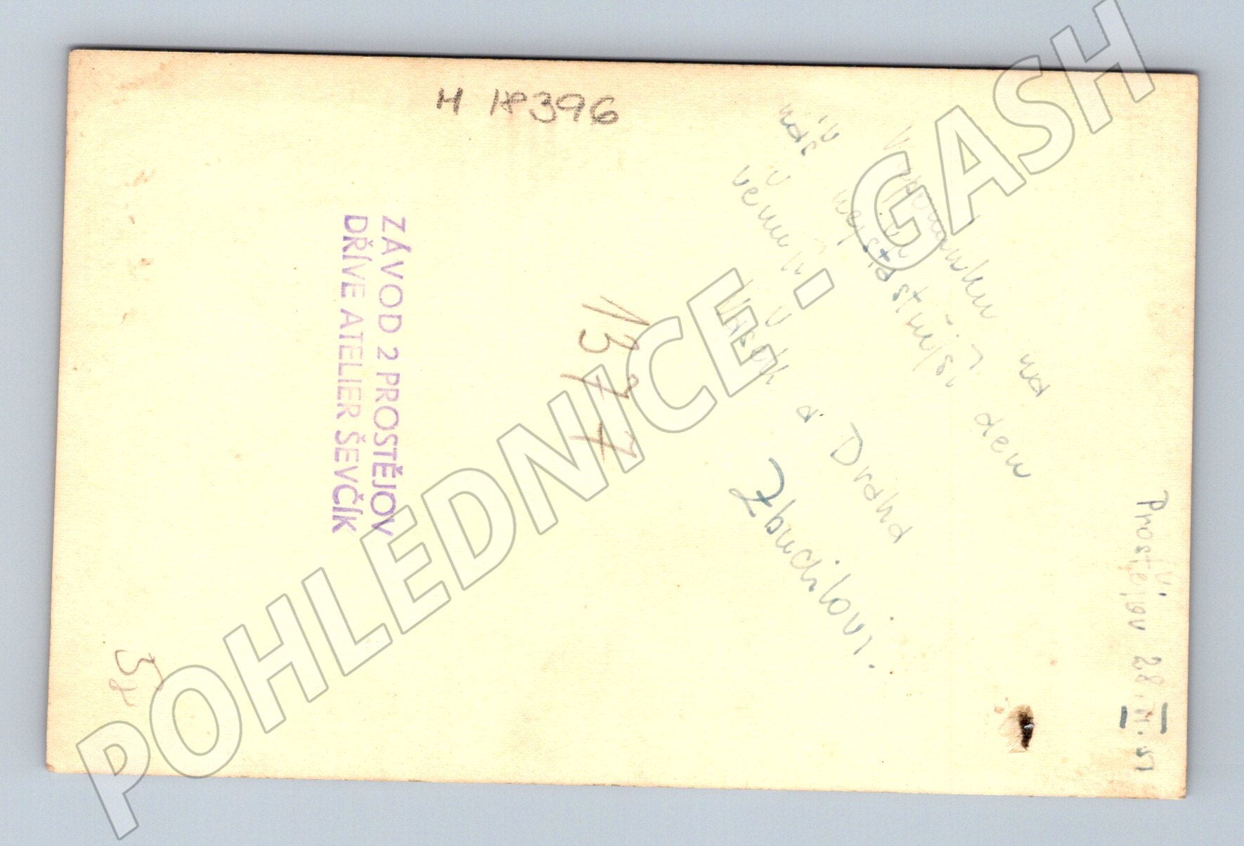 Originální černobílá svatební pohlednice z ateliéru Ševčík (Prostějov, někdejší Atelier Ševčík). Pohlednice zachycuje novomanželský pár ve slavnostním oblečení typickém pro první polovinu 20. století (pravděpodobně 40.–50. léta). Na zadní straně je ručně psaný věnovací text a razítko ateliéru, což zvyšuje sběratelskou hodnotu pohlednice. Vhodné pro milovníky historické fotografie či genealogie. Stav viz foto, mírné opotřebení odpovídající stáří.