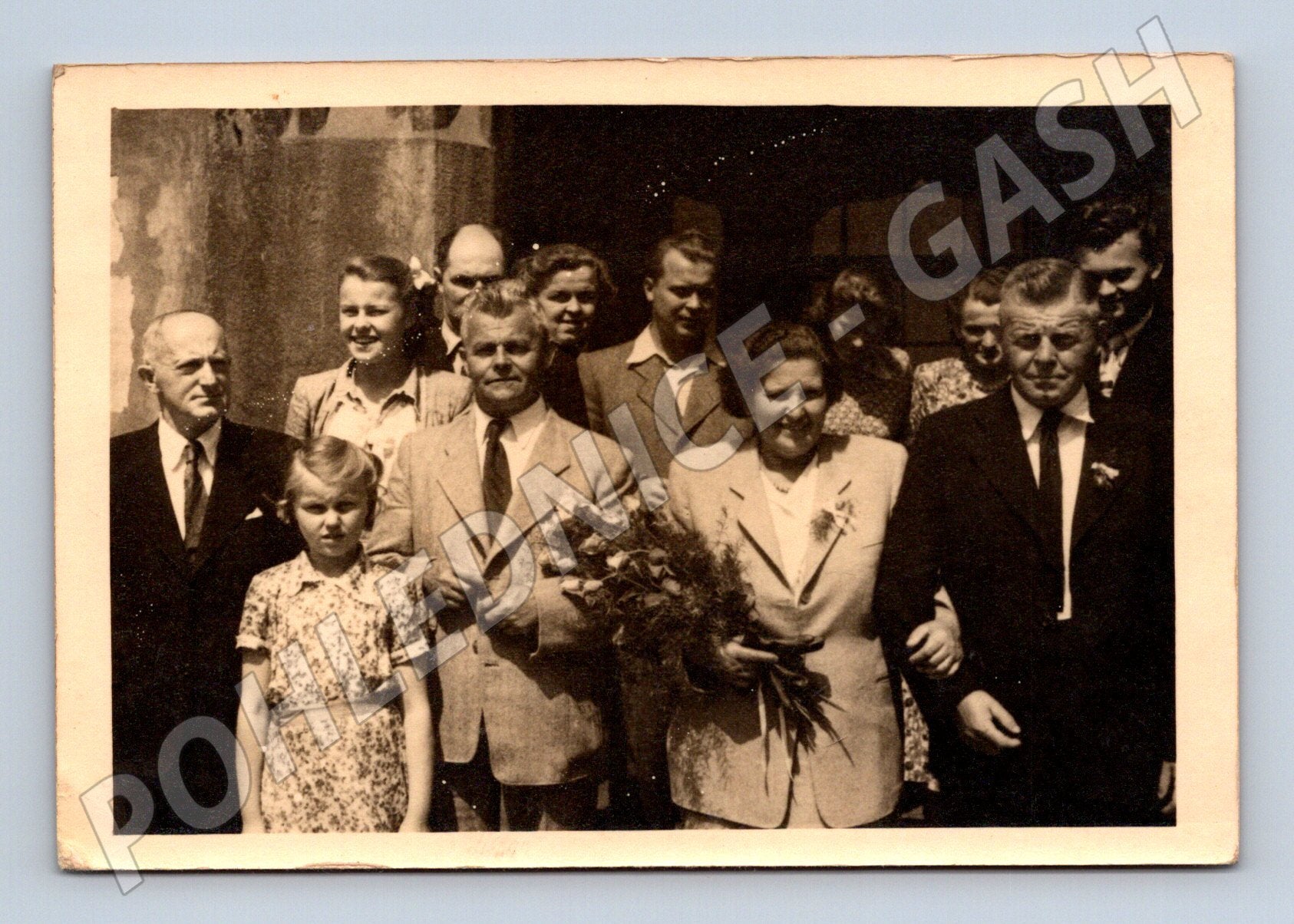 Originální černobílá pohlednice menšího formátu zobrazující skupinu lidí při slavnostní příležitosti – pravděpodobně svatba nebo rodinné setkání. Pohlednice nese dobové znaky 40.–50. let, na zadní straně je razítko SPOJENÉ FOTOZÁVODY a další texty. Výborný dokument o životě v bývalém Československu, vhodná pro sběratele i milovníky historie. Stav viz foto, velmi dobrý – pouze mírné známky stáří, rohy mírně ohlé.
