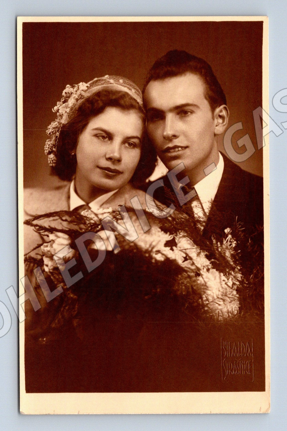 Stará svatební pohlednice – ženich a nevěsta, portrét
