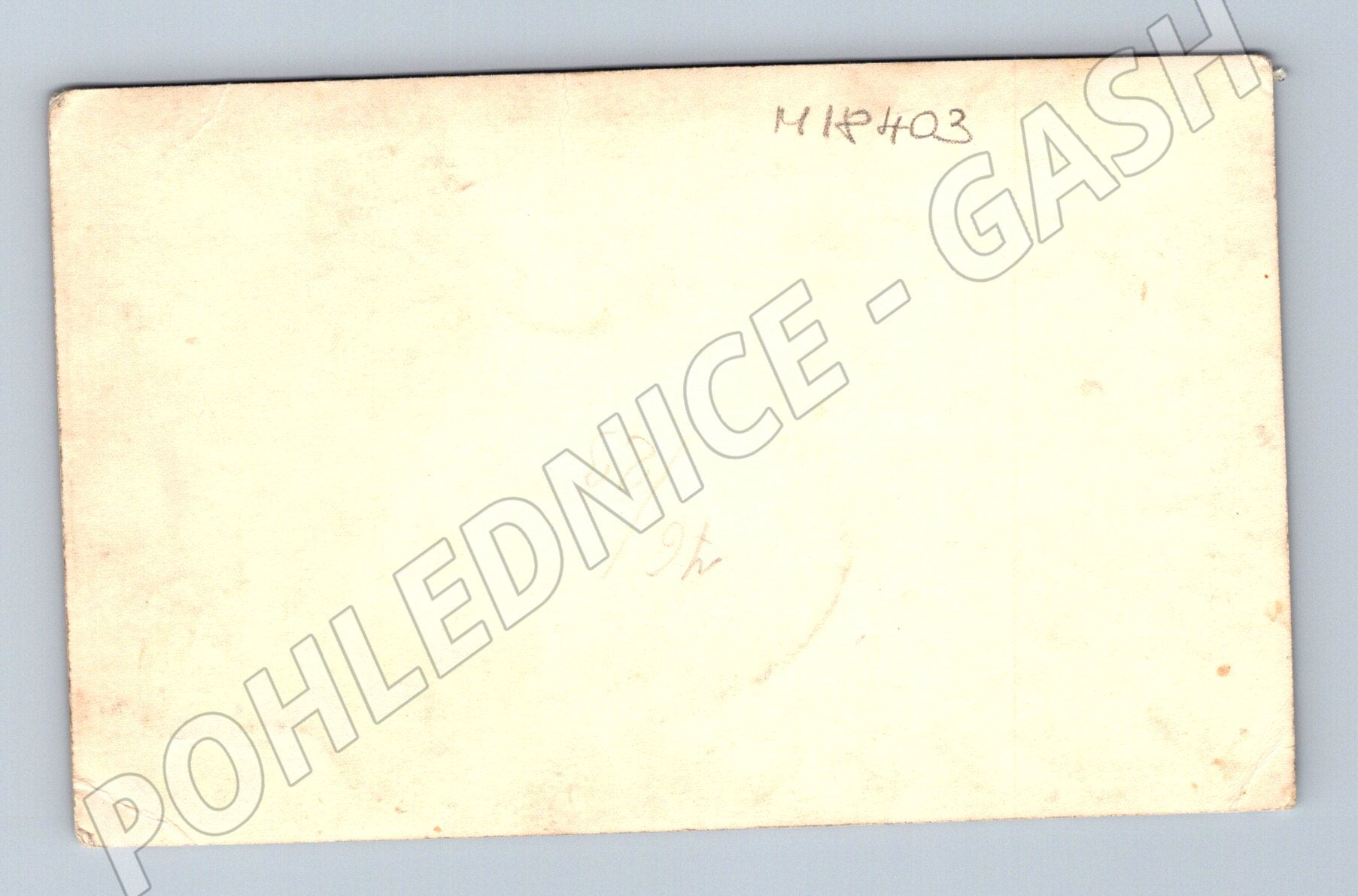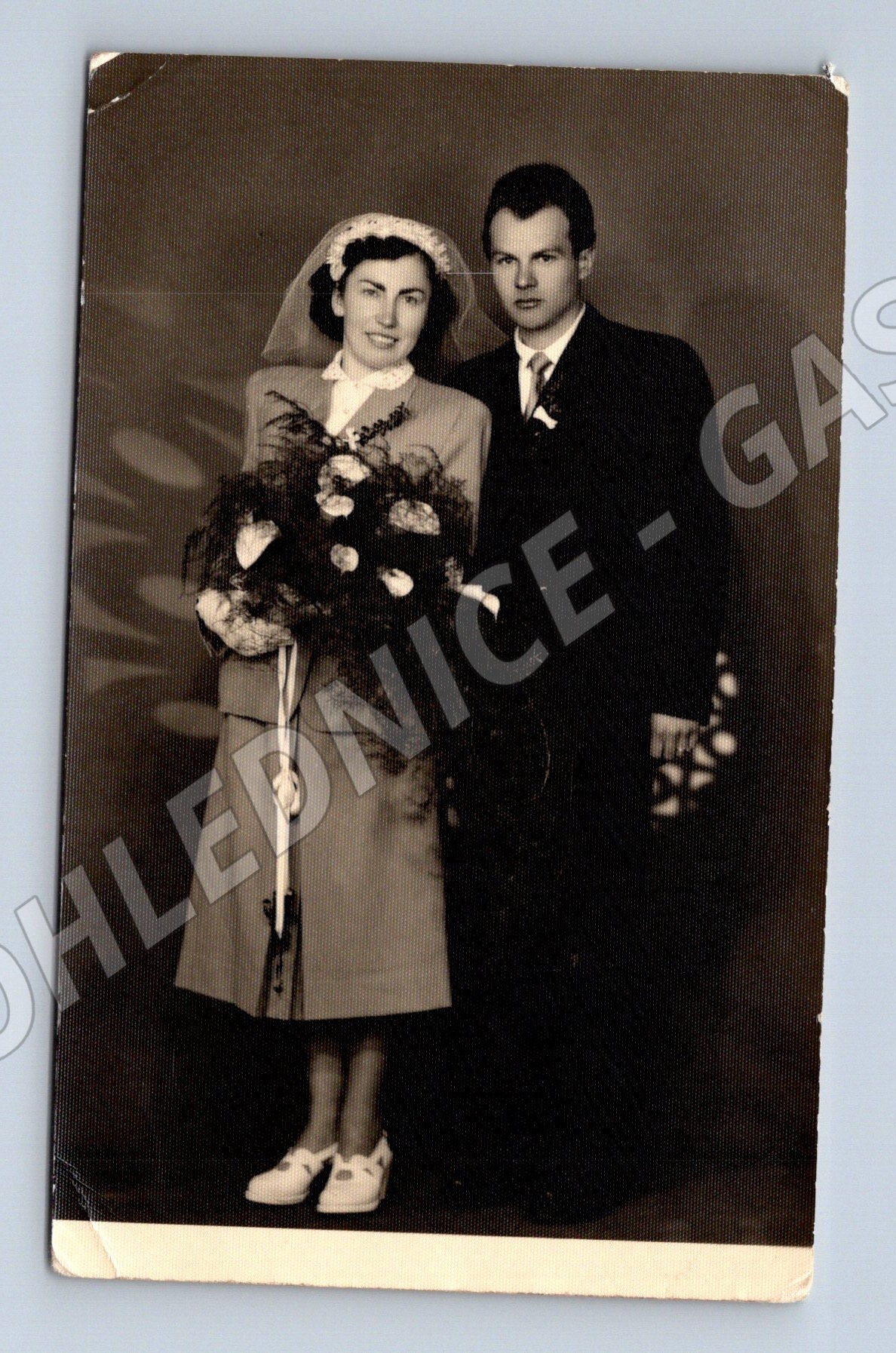 Originální černobílá fotografická pohlednice zachycující svatební portrét muže a ženy, pravděpodobně z první poloviny 20. století. Žena je oblečena ve světlých šatech a závoji, drží svatební kytici, muž má slavnostní oblek s kravatou. Pohlednice je ve vintage stylu, na okrajích mírné opotřebení a lehké ohyby. Zadní strana je nepopsaná, jen s drobným číslem tužkou. Skvělý sběratelský kousek vhodný do sbírek historických portrétů a starých pohlednic.
