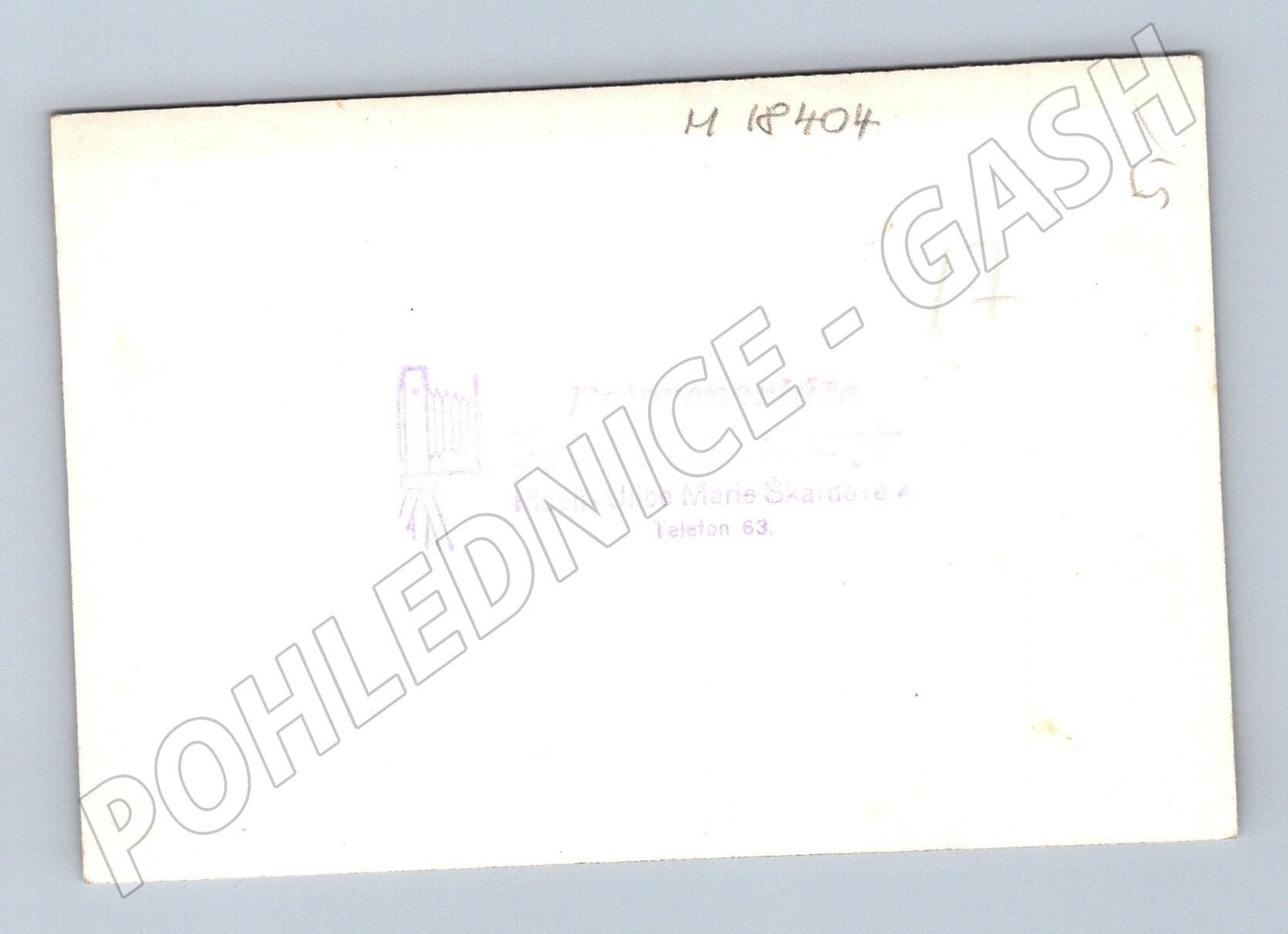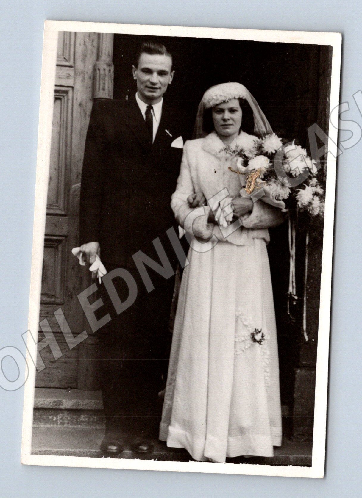 Originální stará černobílá svatební pohlednice z Čech, malý formát. Na přední straně je vyobrazen novomanželský pár ve slavnostním oděvu stojící před dveřmi, pravděpodobně pořízeno před kostelem či radnicí. Zadní strana je nepoštovní, je zde razítko místního fotografa. Jedná se o autentický dobový snímek, ideální pro sběratele historických pohlednic, milovníky retro fotografií či zájemce o českou historii a tradice. Pohlednice nese drobné známky stáří a manipulace, stav viz foto.