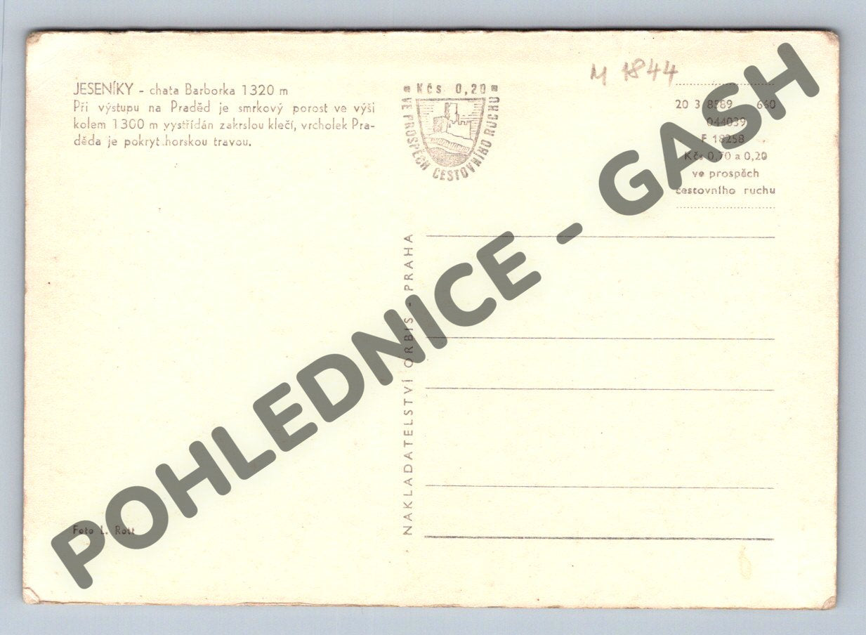 Originální stará pohlednice zachycující chatu Barborka v Jeseníkách ve výšce 1320 m s pohledem na vrchol Pradědu, pokrytý horskou travou. Černobílá pohlednice s popisem na zadní straně poskytuje autentický dobový pohled na krásu horské krajiny v Jeseníkách. Ideální pro sběratele pohlednic, milovníky hor a historie českých pohoří. Vydavatel Orbis Praha, foto L. Rott.