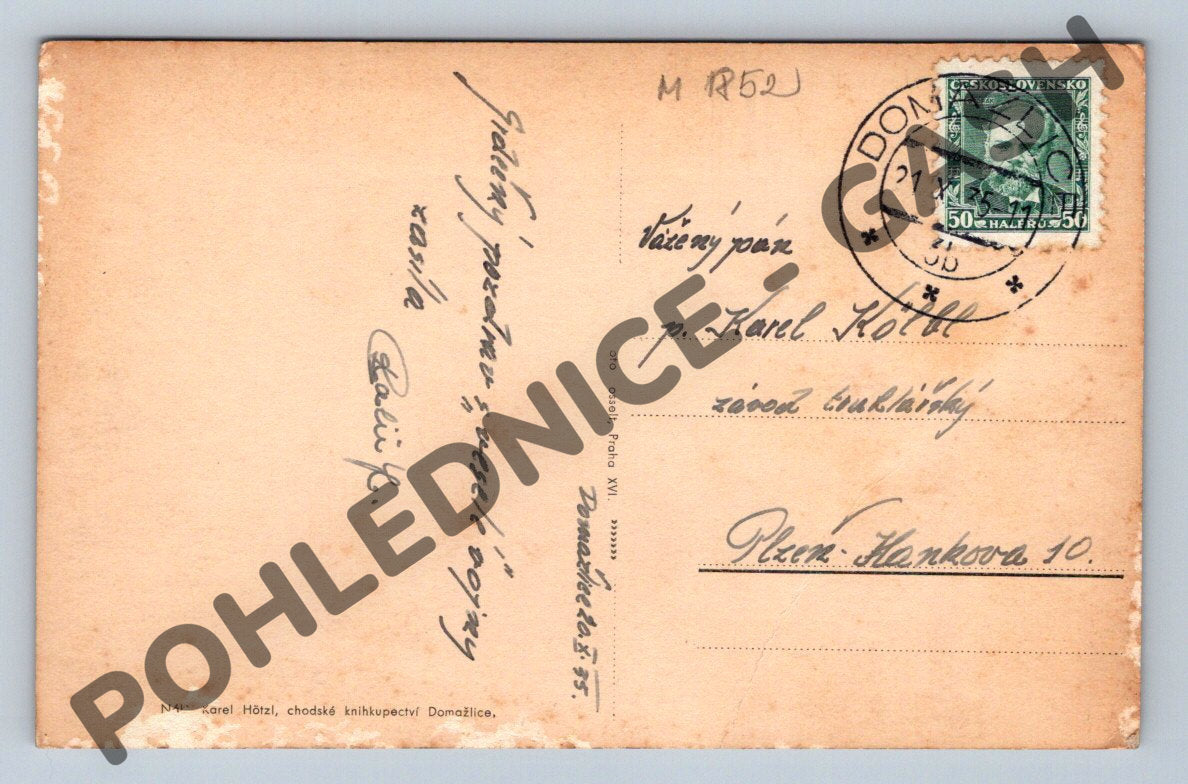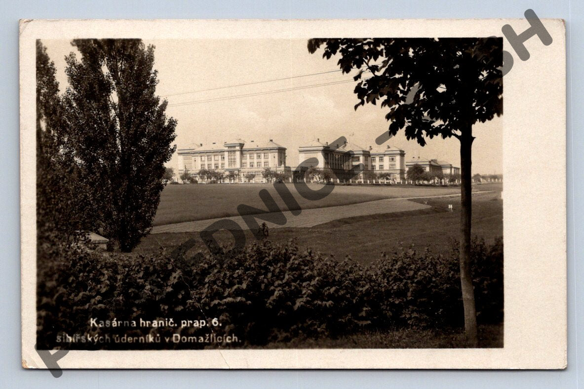 Starobylá černobílá pohlednice zobrazující Kasárna hranič. prap. 6. sibiřských úderníků v Domažlicích. Na přední straně je jasně vidět rozlehlá kasárenská budova s parkovou úpravou v popředí. Zadní strana pohlednice je použita, opatřena známkou a poštovním razítkem z období první republiky, s rukopisným pozdravem. Vydal Karel Hözl, chodské knihkupectví Domažlice. Cenný sběratelský kousek dokumentující vojenskou historii Domažlic a meziválečné Československo. Formát odpovídá pohlednicím vydaným do roku 1950, vhodné i pro milovníky vojenské tématiky a regionální historie. Stav odpovídá stáří - lehce zažloutlá, místy drobné opotřebení hran.