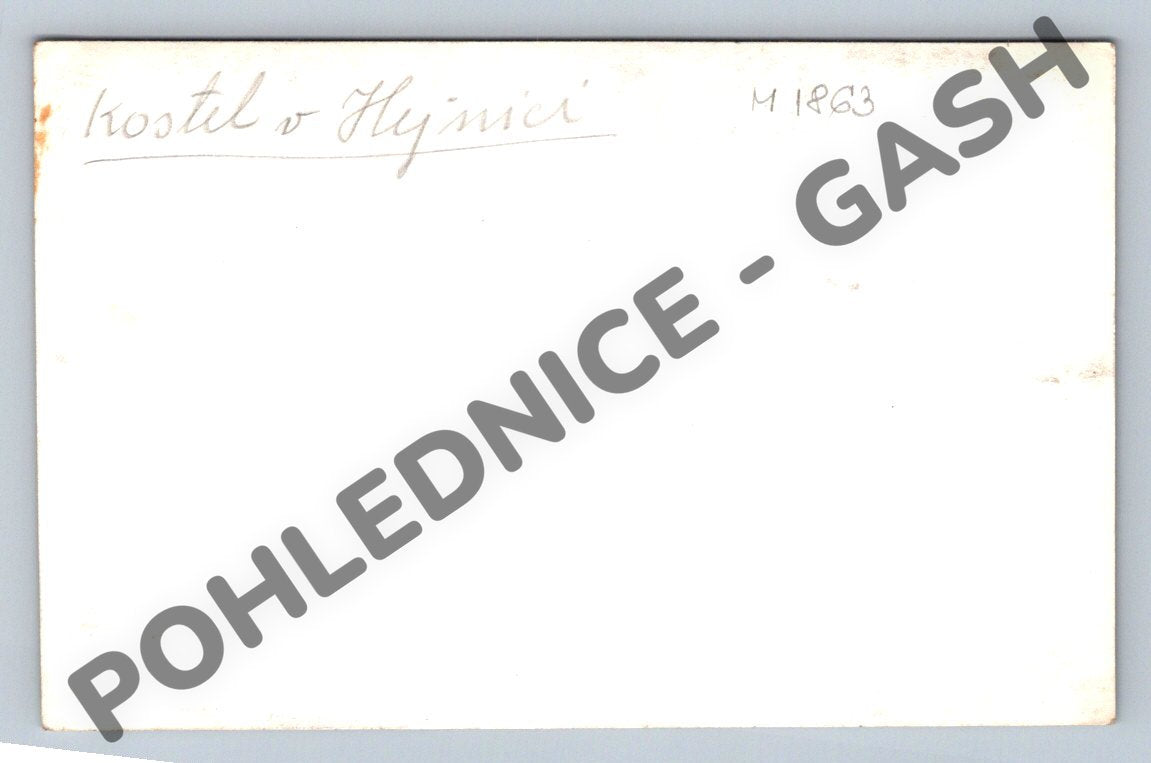 Originální černobílá pohlednice znázorňující kostel v Hynicích. Na pohlednici je zachycena část exteriéru kostela s barokními prvky a dvěmi sochami na podstavcích. Snímek ukazuje také okolní zástavbu a strom přímo před kostelem. Zadní strana je čistá, pouze s ručně psaným popisem kostel v Hynicích . Vhodné pro sběratele historických pohlednic, regionální historii či architekturu. Stav odpovídá stáří, viz foto.