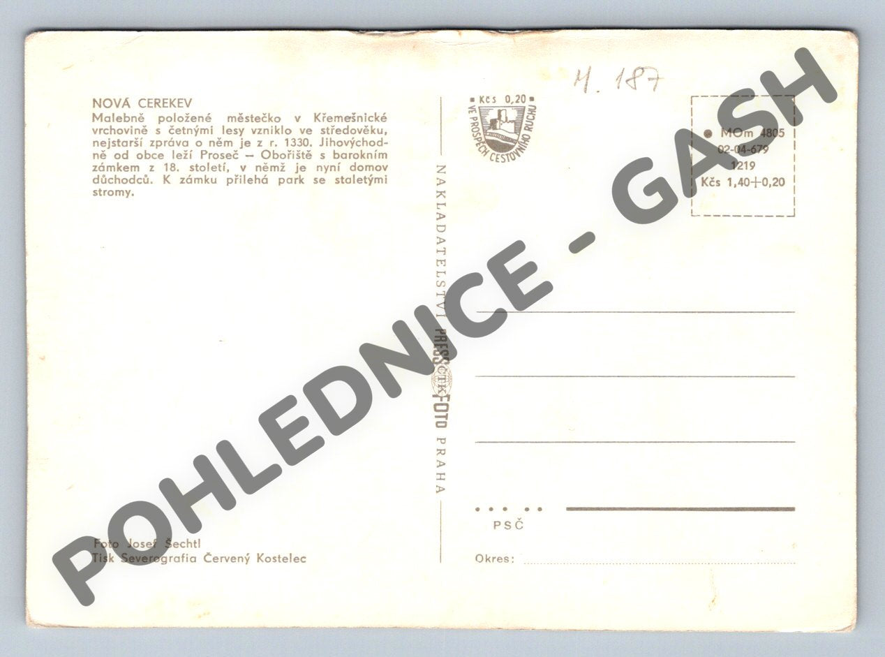 Pohlednice zachycuje malebné městečko Nová Cerekev v okrese Pelhřimov, umístěné v Křemešnické vrchovině. Na přední straně jsou různé motivy z obce — panoramatický pohled na městečko s kostelem, děti u kašny a pohled na barokní zámek s parkem. Na zadní straně je krátký text s historií města, který připomíná vznik města ve středověku a barokní zámek z 18. století. Pohlednice pochází z tiskárny Severografia Červený Kostelec, autorem fotografie je Josef Šechtl. Krásný sběratelský kousek s historickou atmosférou regionu Vysočina.