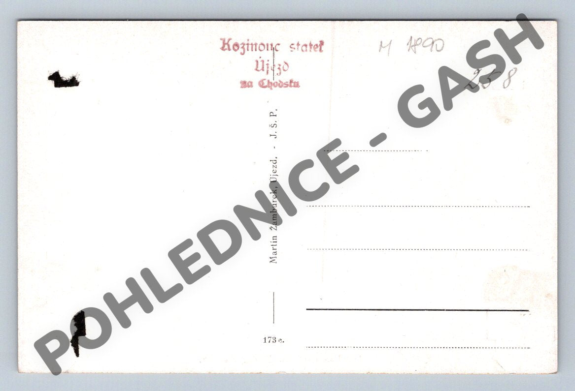 Originální stará pohlednice zobrazující Kozinův statek v obci Újezd na Chodsku. Na přední straně pohlednice je vyobrazen vstupní portál statku s nápisem Kozinovec hospoda a skupina lidí v dobovém kroji, kteří dodávají snímku atmosféru tradičního chodského venkova. Pohlednice je černobílá, stav odpovídá stáří, bez známky poštovního použití. Na zadní straně nese popis místa a vydavatele. Skvělý sběratelský kousek dokumentující regionální etnografii a lidovou architekturu Čech.