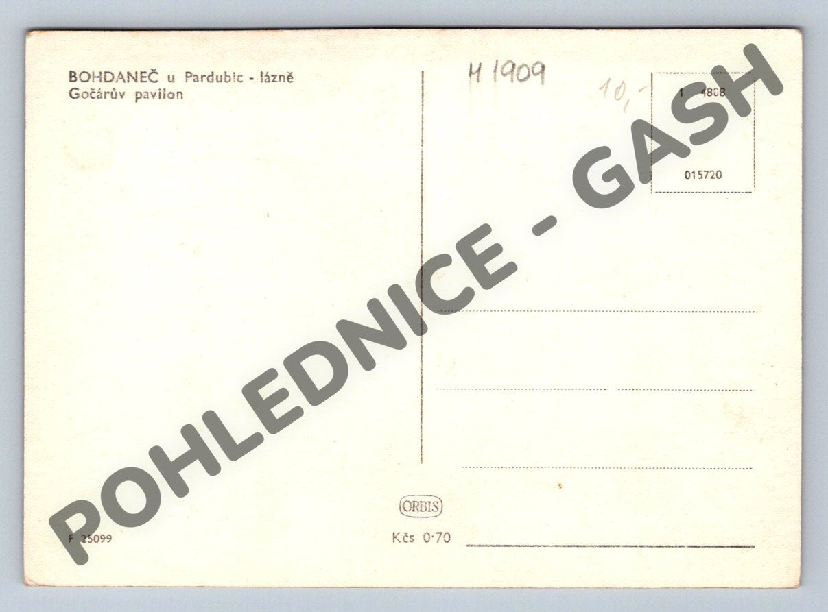Originální stará pohlednice zobrazující Lázně Bohdaneč u Pardubic, konkrétně Gočárův pavilon. Pohlednice zachycuje jedinečný architektonický styl pavilonu a atmosféru lázeňského areálu. Na přední straně je černobílý snímek s několika postavami a lavičkou v popředí, na zadní straně je popis: BOHDANEČ u Pardubic - lázně, Gočárův pavilon . Jedná se o sběratelsky zajímavý kus v pěkném stavu bez známek odeslání. Ideální doplněk do sbírky historických pohlednic s motivy architektury nebo lázeňství v ČR.