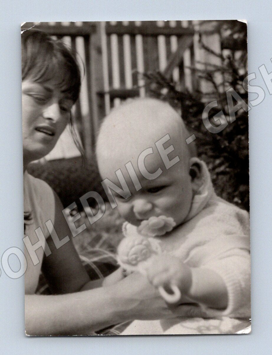 Originální černobílá pohlednice se záběrem ženy a malého dítěte na zahradě. Dítě drží v ruce chrastítko, v pozadí je vidět plot a příroda. Fotografie pravděpodobně pochází z období 60.–70. let 20. století. Na zadní straně je ručně napsaný kód. Pohlednice je ve velmi dobrém stavu s minimálním opotřebením. Skvělý sběratelský kousek s rodinnou či osobní tematikou.