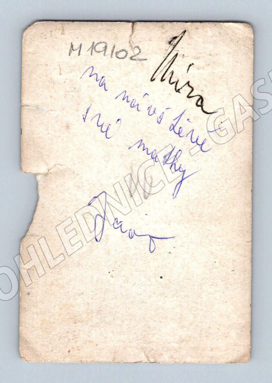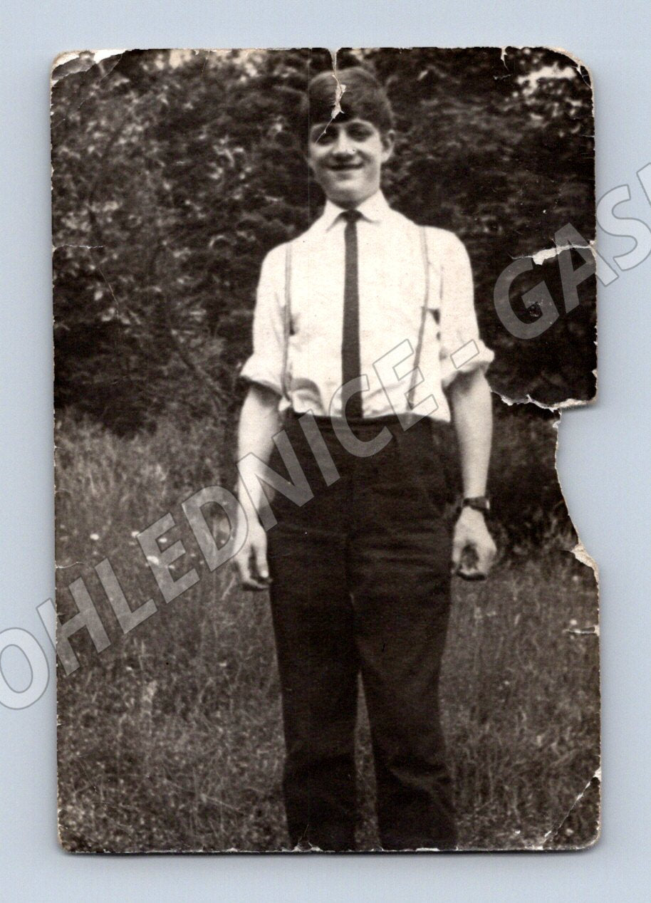 Starší černobílá pohlednice s portrétem mladého muže v přírodě. Osoba je oblečená ve světlé košili, tmavých kalhotách s kšandami a kravatou. Pohlednice nese známky stáří a poškození - je natržená a rohy jsou opotřebované. Na zadní straně rukopisné věnování v češtině včetně jména a datace M19102. Autentický dobový dokument vhodný do sbírky historických pohlednic nebo pro zájemce o osobní dějiny. Přibližné stáří odhadem první polovina 20. století.