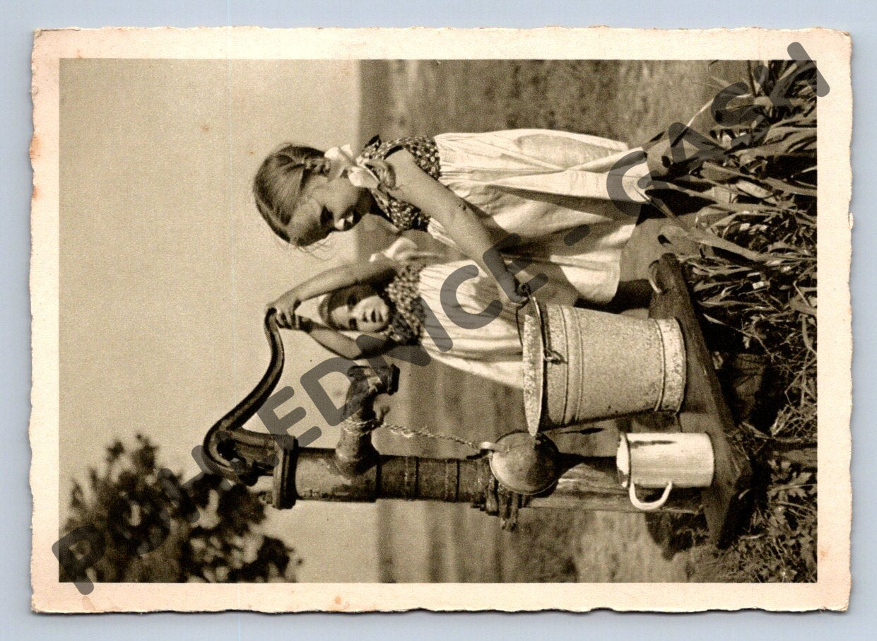 Starší černobílá pohlednice s motivem dvou dívek u ruční pumpy na vodu, jedna napouští do kbelíku. Pohlednice je označena Mütterferien-Aktion Zentrale Prag a vznikla podle popisku technikou Rolleiflex, fotograf Georg Schmidt. Odpovídá období první poloviny 20. století, kraje lehce opotřebené, stav viz foto. Zajímavý dokument doby a vhodné pro sběratele historických pohlednic z Československa.