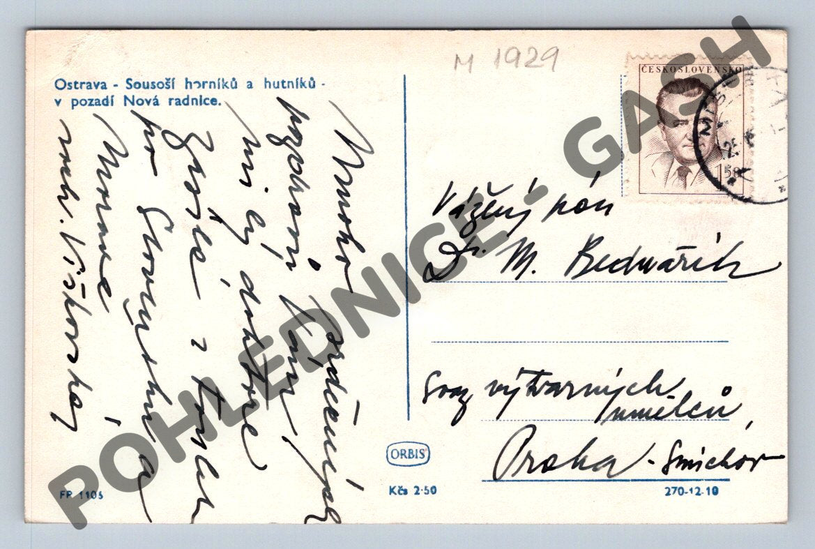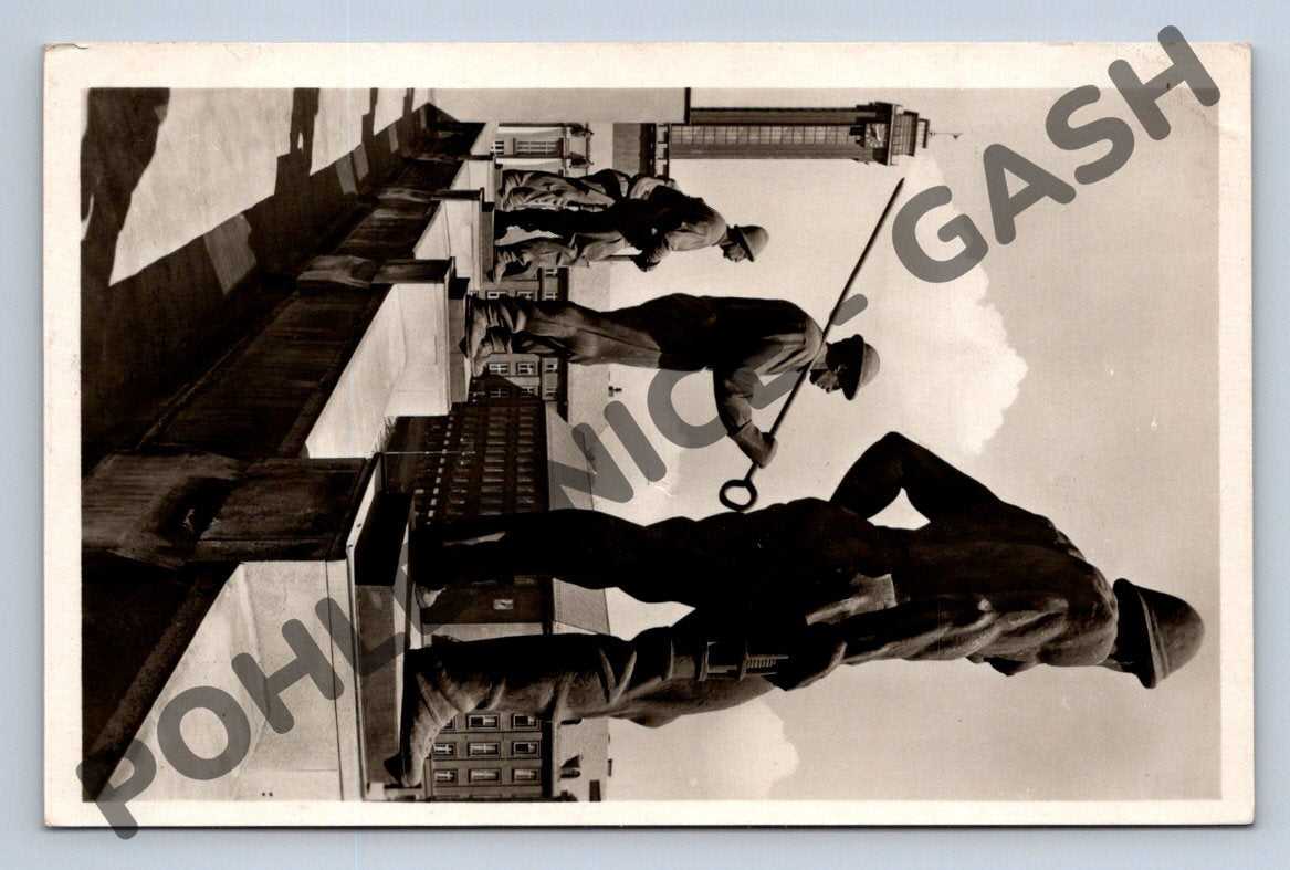 Originální černobílá pohlednice s motivem sousoší horníků a hutníků v Ostravě, v pozadí budova Nové radnice. Pohlednice je popsána a frankována známkou ČSR, prošlá poštou, ručně psaný text. Jedná se o menší formát pohlednice typický pro období první poloviny 20. století. Výborný sběratelský stav, vzácný pohled na průmyslovou architekturu Ostravy a významné sochařské dílo.