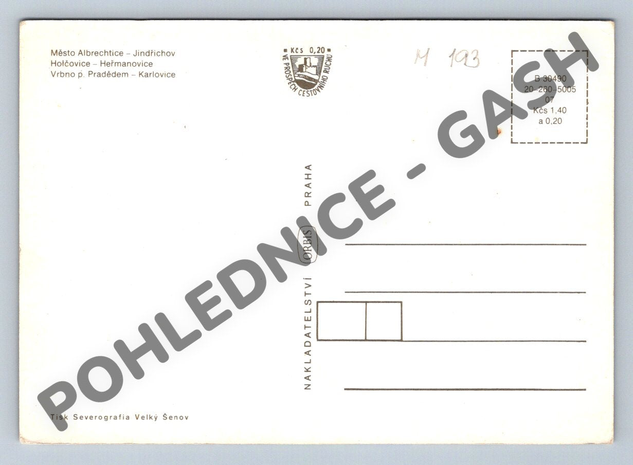 Originální pohlednice Město Albrechtice a okolí zachycuje krásy a významná místa města Albrechtice ve Slezsku a jeho nejbližšího okolí. Na přední straně je umístěn barevný kolážový motiv s fotkami vybraných lokalit a středovou mapou regionu. Pohlednice je neprošlá, zachovalá, s výraznými barvami. Na zadní straně uveden vydavatel Orbis Praha a tisk Severografia Velký Šenov. Ideální doplněk pro sběratele historických pohlednic, regionálních památek i obdivovatele Jeseníků.