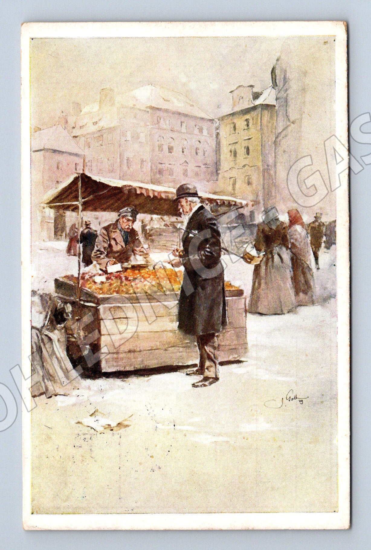 Starý malovaný zimní trh – pohlednice ČSR, malý formát, do 1950