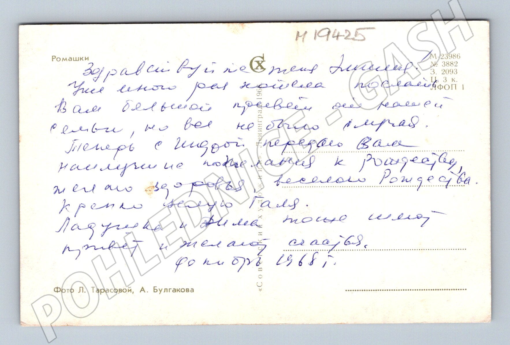 Originální pohlednice s motivem kopretin (romashki) z období Sovětského svazu. Pohlednice je popsaná ručně v ruštině, což jí dodává osobité kouzlo a autenticitu historické korespondence. Na zadní straně najdeme osobní vzkaz a označení fotoautorů L. Tarasovová, A. Bulgakova. Rozměry klasického formátu. Vhodná pro sběratele pohlednic s květinovými motivy i pro zájemce o ruskou a sovětskou korespondenci. Stav dle skenu – mírné opotřebení odpovídající stáří. Unikátní přírůstek do sbírky!
