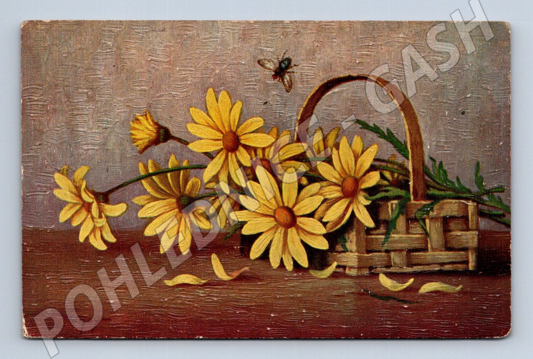 Starobylá pohlednice zhotovená v Německu se žlutými květy kopretin v košíku, název W. Hoy - Gelbe Margeriten (Yellow Marget flowers). Pohlednice je barevná s jemným embosovaným povrchem, na přední straně je umělecké vyobrazení květin, na zadní straně ručně psaný text a známky poštovního provozu. Číslování pohlednice: 1289, vydáno firmou Degi. Vhodné pro sběratele historických pohlednic a milovníky květinových motivů. Stav odpovídá stáří, viz foto.