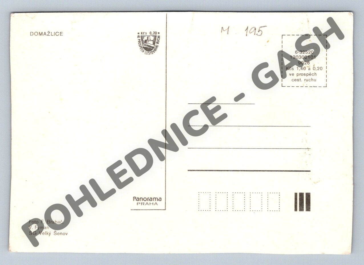 Barevná pohlednice města Domažlice s několika fotografickými záběry hlavních pamětihodností města, včetně historického náměstí s podloubím, věží a dalších významných budov. Na pohlednici je také stylizovaný motiv postav v tradičním chodském kroji. Na zadní straně je nevyplněná adresní část s tištěnými informacemi vydavatele Panorama Praha. Zachovalý stav, bez popisu, nese drobné známky stáří na hranách. Ideální pro sběratele československých pohlednic a regionálních témat.