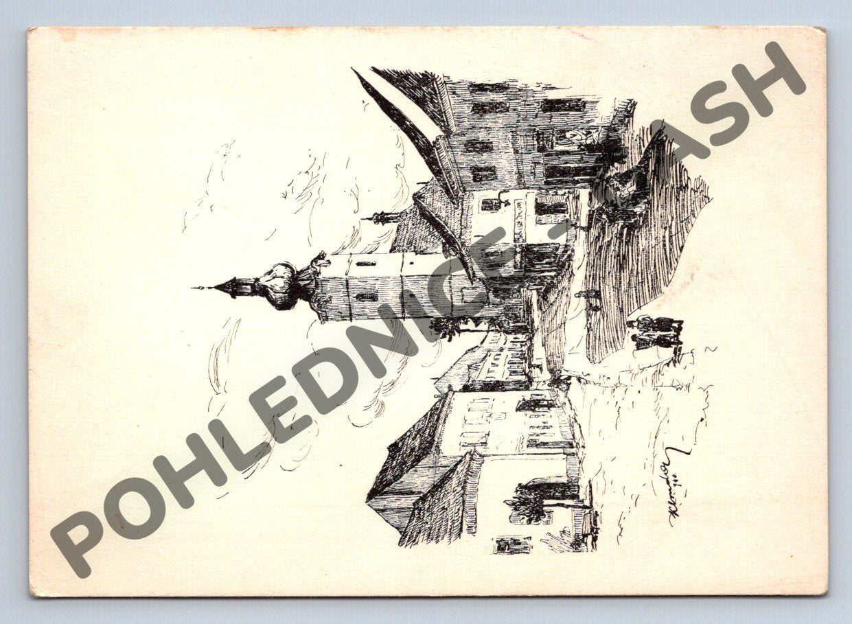 Pohlednice s černobílou kresbou centra města Husinec, rodiště Mistra Jana Husa. Námět ilustruje historické budovy s dominantní věží, zřejmě pohled na Husův rodný dům. Na zadní straně je výrazné razítko s portrétem M. Jana Husa a českým nápisem k výročí husitského hnutí. Na okraji štítek s názvem autora kresby – J. Klouda. Pohlednice nebyla použita, není popsána ani oražená poštou. Velmi pěkný sběratelský stav, drobné známky stáří viz foto. Odhadováno vydání kolem roku 1959, vhodné pro sběratele historických pohlednic s tématem českých měst a památek.