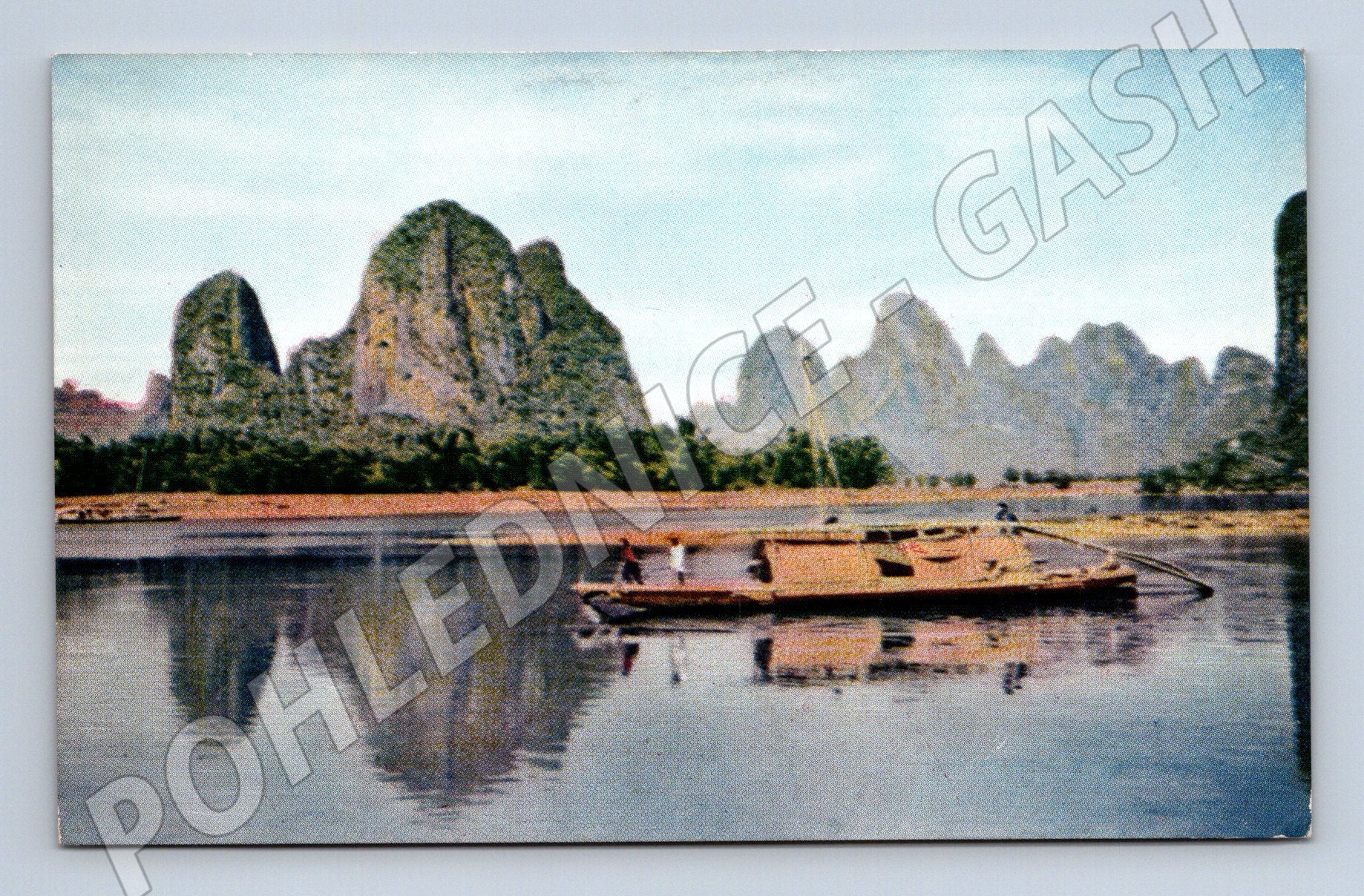 Nabízím originální pohlednici s motivem tradiční dřevěné lodě na klidné řece s panoramatem výrazných skalnatých hor v pozadí. Pohlednice zachycuje typický obraz vodní dopravy v malebné krajině, která může připomínat scenérie v jihovýchodní Asii, zejména oblast řeky Li v Číně. Jedná se o barevnou pohlednici, pravděpodobně z poloviny 20. století, neprošlou poštou. Zadní strana je čistá, pouze s číselným označením. Skvělý sběratelský kousek pro milovníky vodní dopravy nebo exotických krajin.
