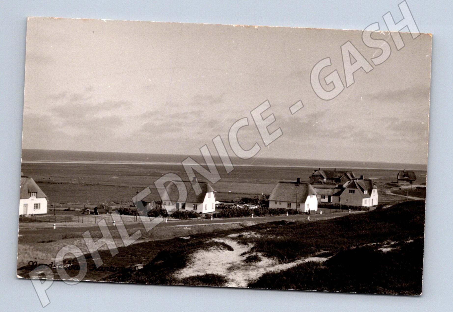 Černobílá pohlednice s motivem pobřežní vesničky a tradičních domů s doškovou střechou v oblasti Rantum na ostrově Sylt v Německu. Na pohlednici jsou vidět klidné pobřeží, otevřená krajina a několik typických staveb, které odráží jedinečnou atmosféru Severního moře. Na přední straně je nápis Nordseebad Rantum/Sylt . Zadní strana pohlednice je nepopsaná, bez známky a bez razítka. Pohlednice je ve sběratelském stavu, s drobnými známkami stáří a opotřebení.