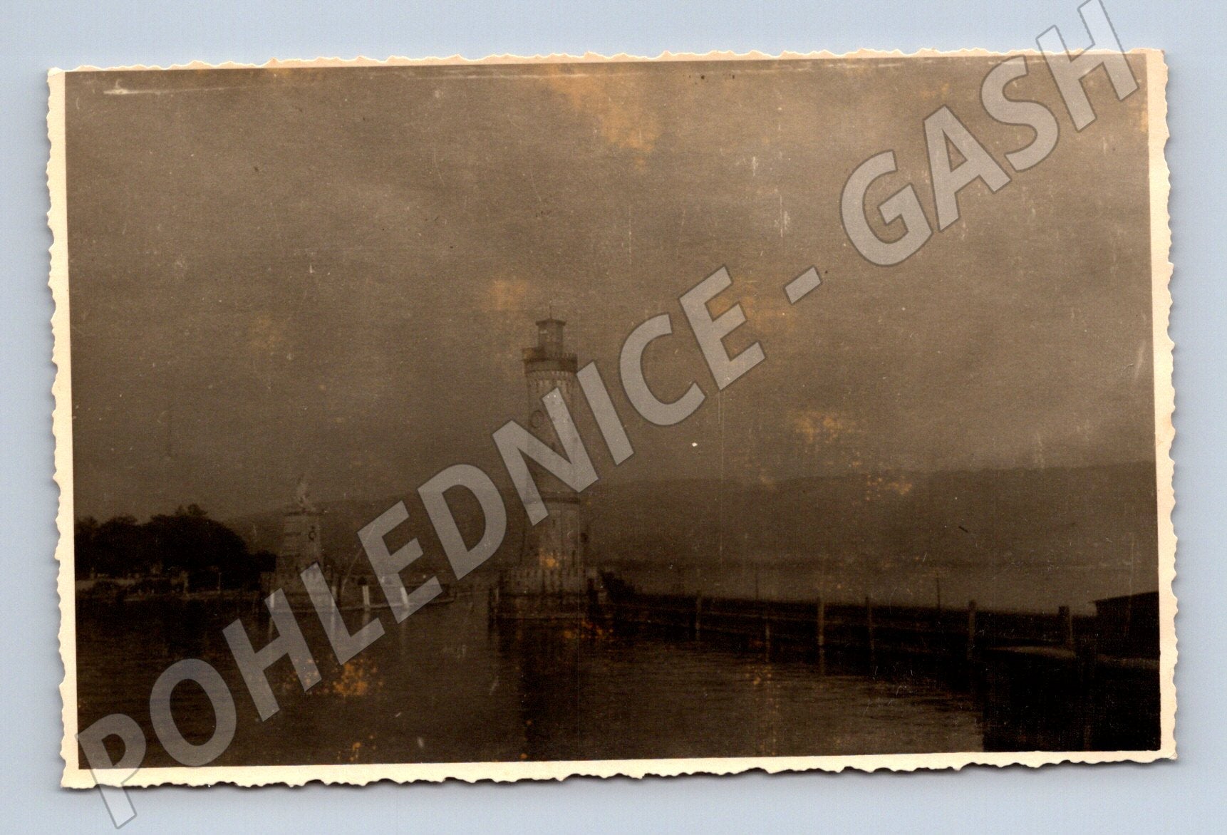 Starší černobílá pohlednice zachycující přístav s majákem a lví sochou na břehu jezera, zřejmě z evropské lokality (pravděpodobně přístav Lindau u Bodamského jezera v Německu). Na pohlednici je patrná klidná vodní hladina, část mola a charakteristické stavby přístavu. Pohlednice je většího formátu, má zažloutlé okraje a stopy stáří, což potvrzuje její sběratelskou hodnotu. Zadní strana je nepopsaná, pouze s tiskovou dělicí čarou a číslem. Pohlednice je vhodná pro sběratele starých pohlednic s tématikou vodní dopravy a přístavů.