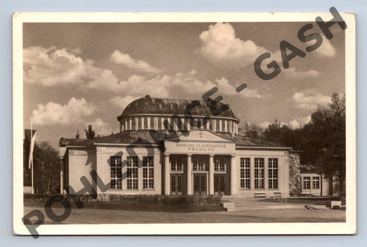 Originální černobílá pohlednice zachycující Dvoranu Glauberových pramenů ve Františkových Lázních. Na přední straně je vyobrazena ikonická lázeňská budova s jeho rozpoznatelným architektonickým stylem pod letní oblohou. Pohlednice je neprošlá, ve velmi dobrém stavu, bez známek použití. Na zadní straně je uveden popis: Frant. Lázně, Dvorana Glauberových pramenů a výrobce Orbis. Ručně vepsaný letopočet 1973, č. 17030. Sbírkový a dekorativní předmět s atmosférou historických lázní v západních Čechách.