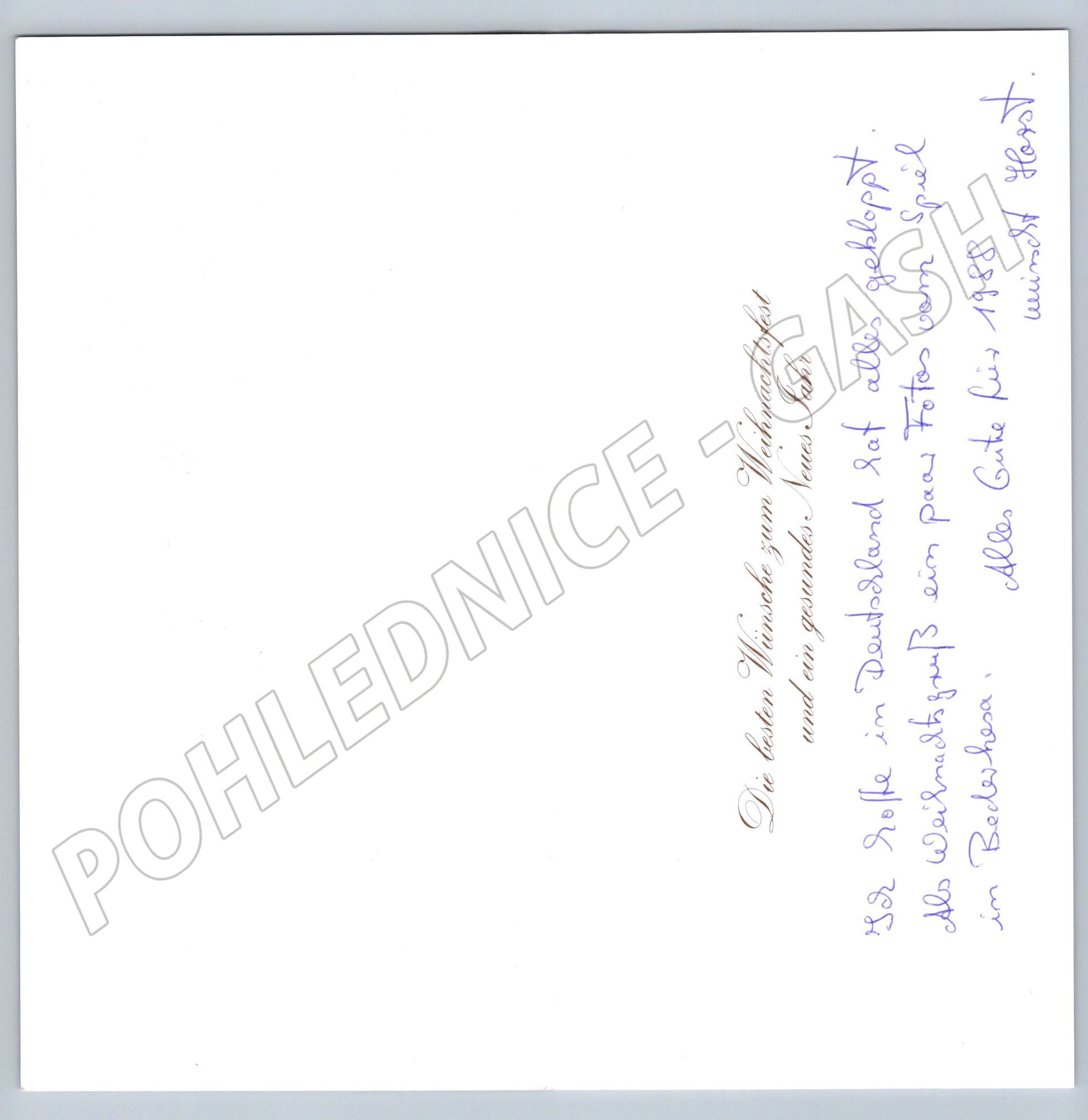 Krásná pohlednice s vánoční zimní scénou, která zachycuje rušné tržiště s lidmi nakupujícími dárky a vychutnávajícími si zimní atmosféru. Pohlednice je ve velmi dobrém stavu, s ručně psaným textem v němčině na zadní straně s přáním k Vánocům a Novému roku z roku 1988. Obrázek evokuje nostalgickou atmosféru starého města, osvětleného světly a zasněženého sněhem. Ideální sběratelský kousek nebo jako inspirace pro milovníky vánoční tematiky.